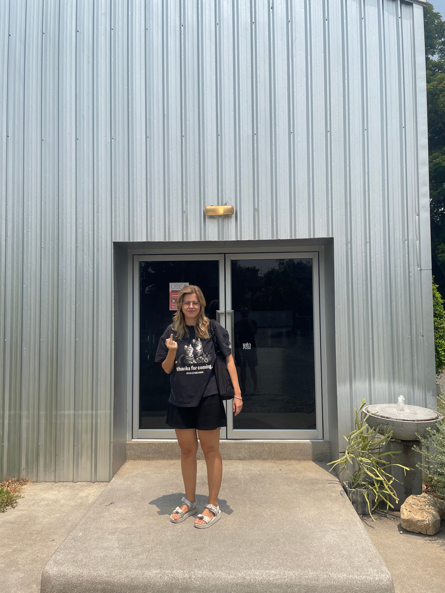 A young woman is captured in a full-body portrait, standing outside a modern building with a light grey, corrugated metal facade. She has shoulder-length, light brown hair and wears glasses, a dark t-…read more