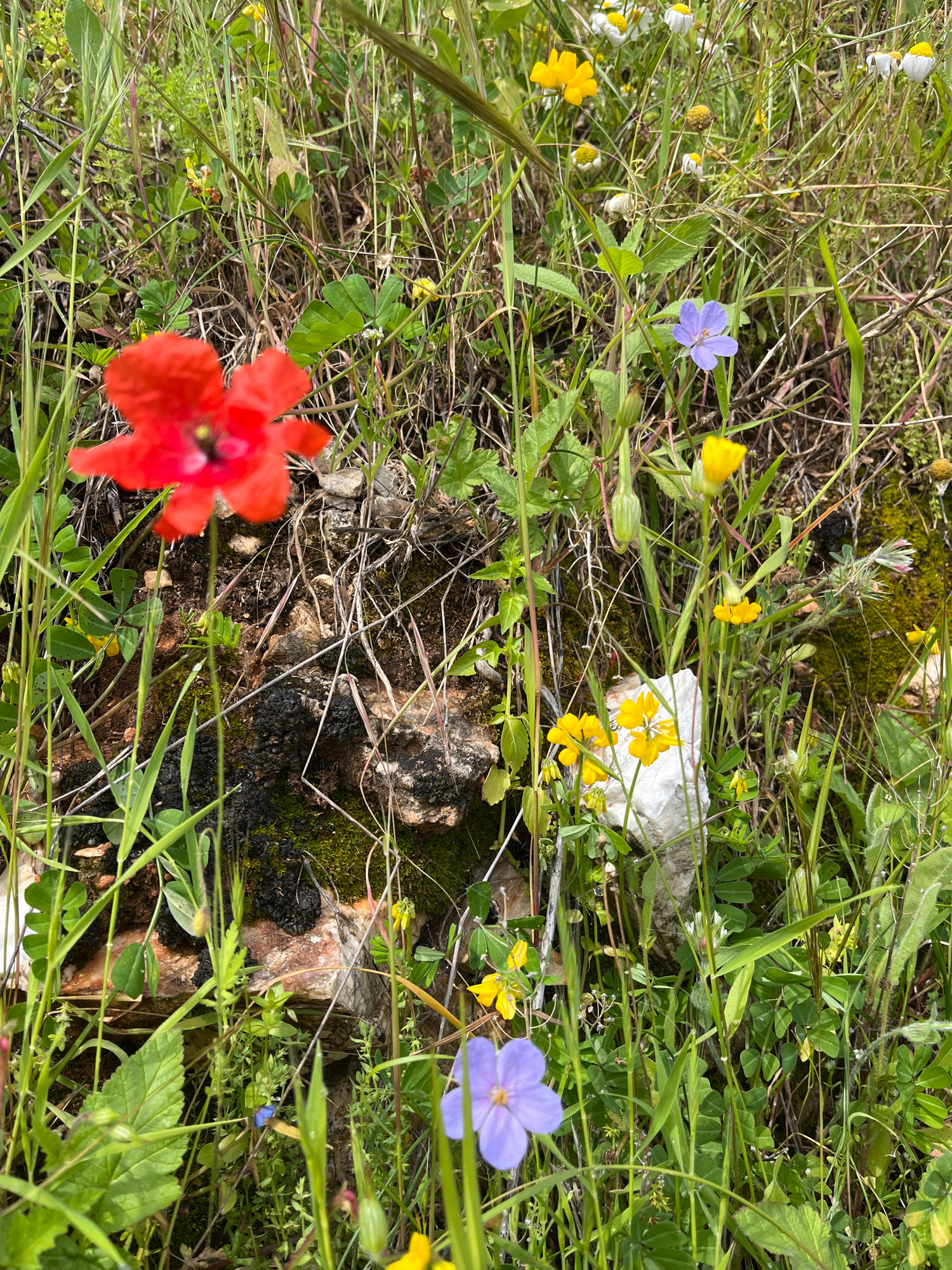The image displays a close-up, ground-level view of a dense, uncultivated natural environment located in Alanya, Turkey. The scene is dominated by a variety of green grasses and herbaceous plants grow…read more