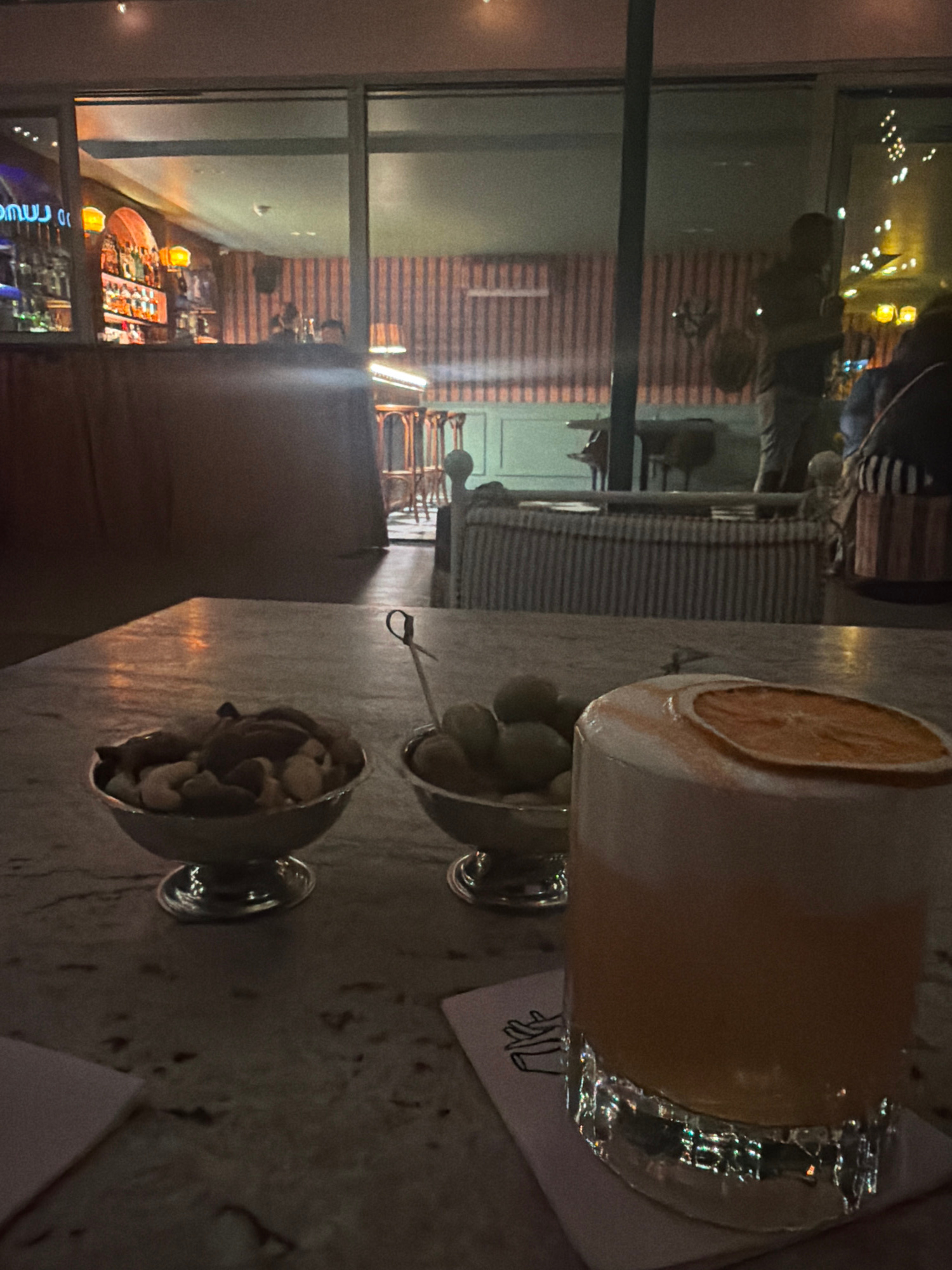 The image captures an indoor nighttime scene, likely within a bar or restaurant, offering a view of an urban landscape through a large window. In the foreground, a light-colored, possibly marble, tabl…read more