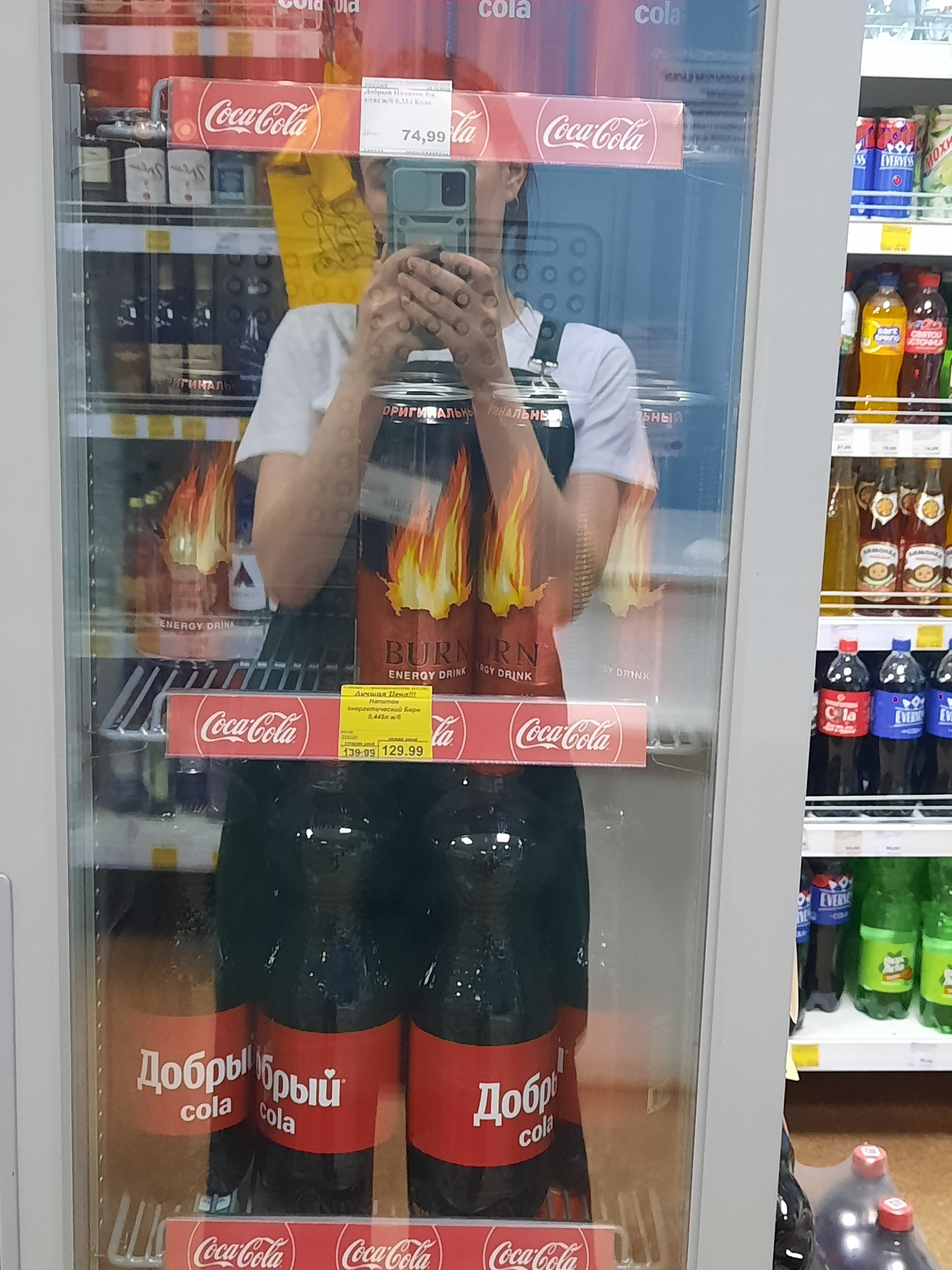 The image shows a person reflected in a refrigerator door in what appears to be a grocery store. The shelves of the refrigerator are stocked with various beverages, including Coca-Cola, "Dobry" cola (…read more