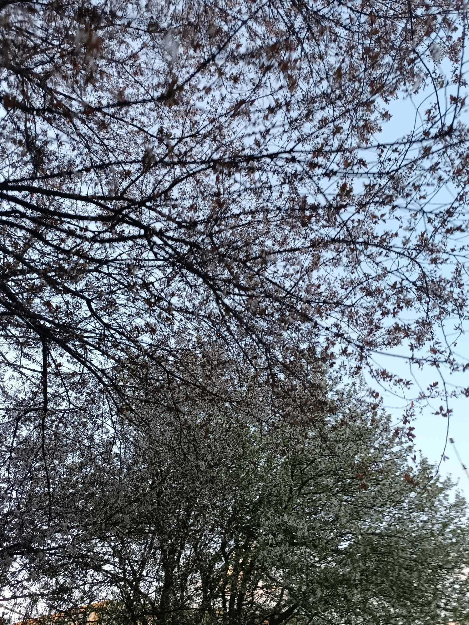 The image shows a view looking up into the branches of several trees against a light blue sky. The trees are in varying stages of bloom, with some having only buds and bare branches, while others are…read more