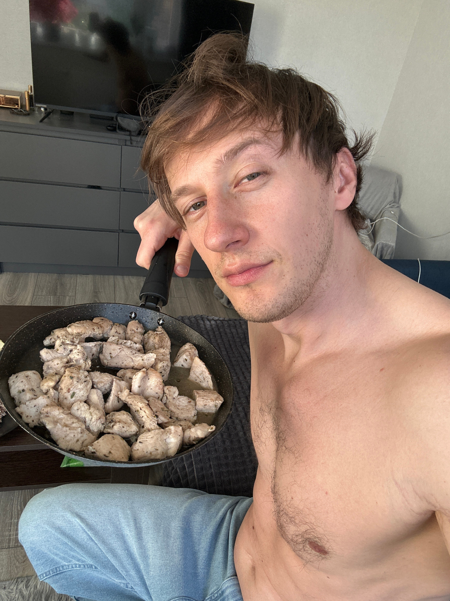 A shirtless man with light brown hair is holding a frying pan containing cooked chicken pieces. He is wearing blue jeans. The background shows a grey cabinet, a black TV, a bed with a blue blanket, an…read more