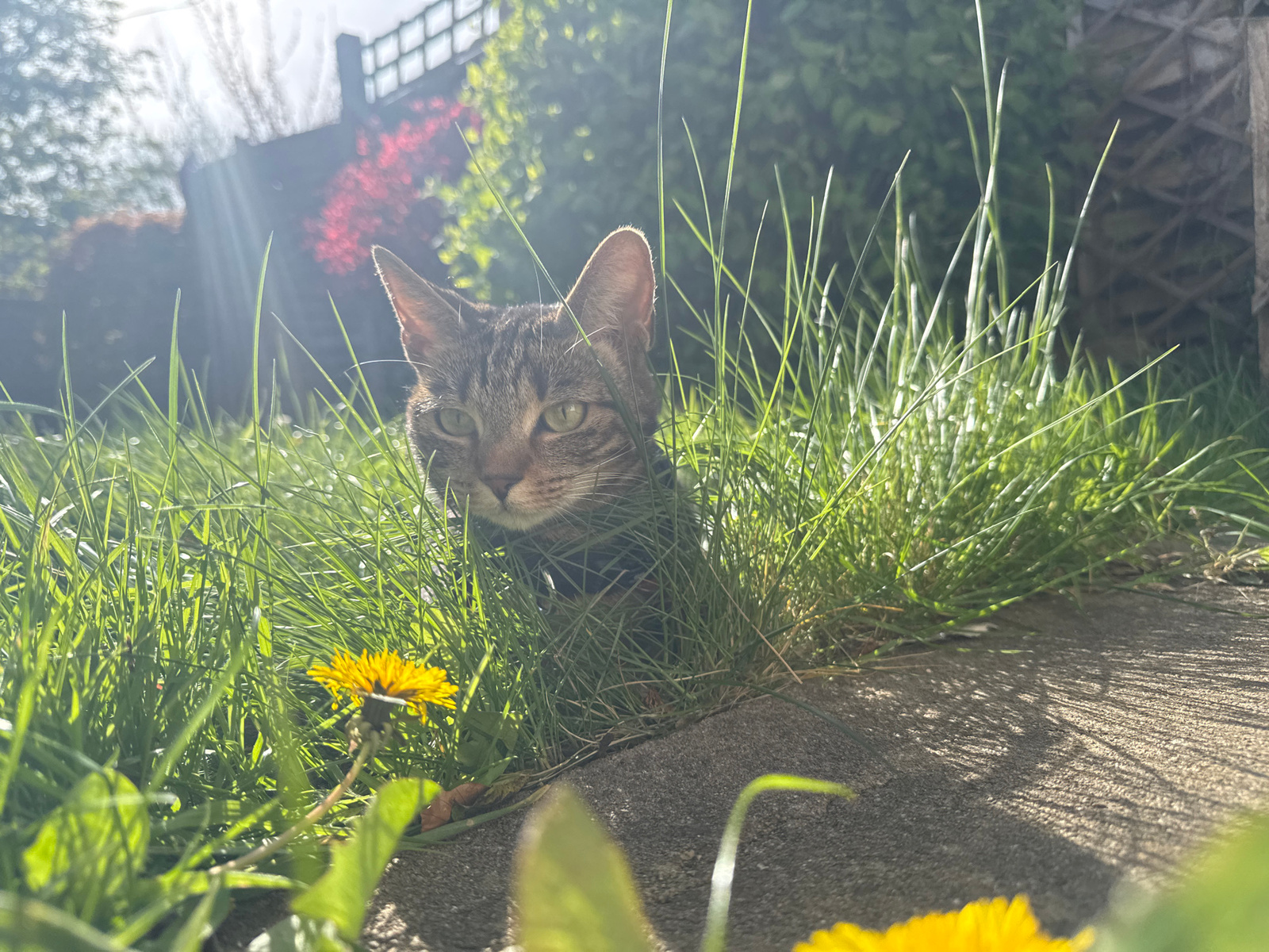 A medium shot captures a tabby cat partially obscured by tall green grass and a few dandelions. The cat, centered in the frame, faces the camera with a calm expression. Its head and upper chest are vi…read more