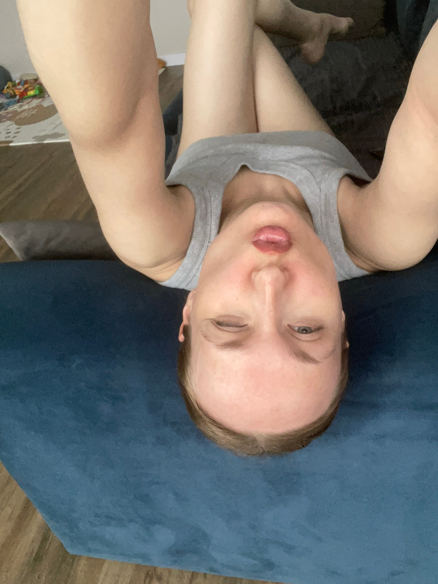 A woman is lying on a blue couch, taking a selfie. She is wearing a gray tank top. Her legs are visible in the lower right of the frame. The location is unknown and cannot be confirmed.