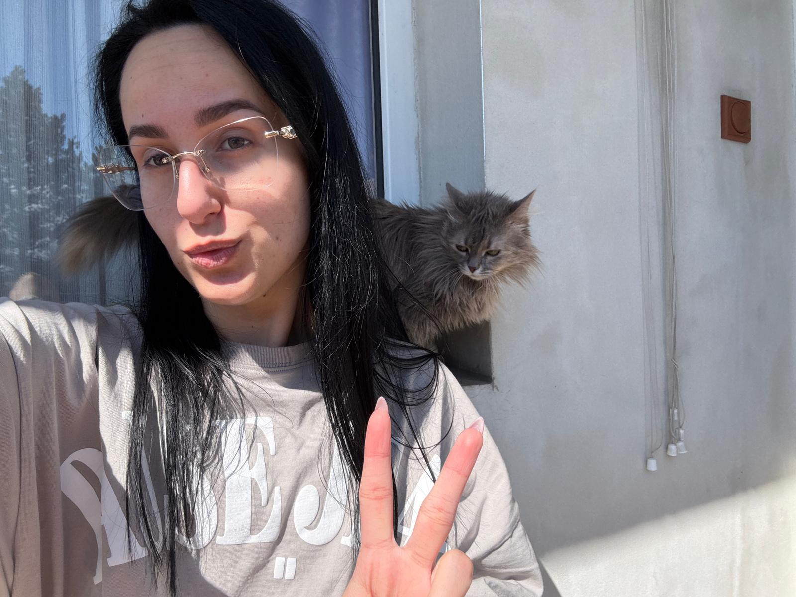 The image is a selfie of a woman with long, black hair and glasses, wearing a light-colored shirt with a white design. She is making a peace sign with her fingers. A gray, fluffy cat is visible in the…read more