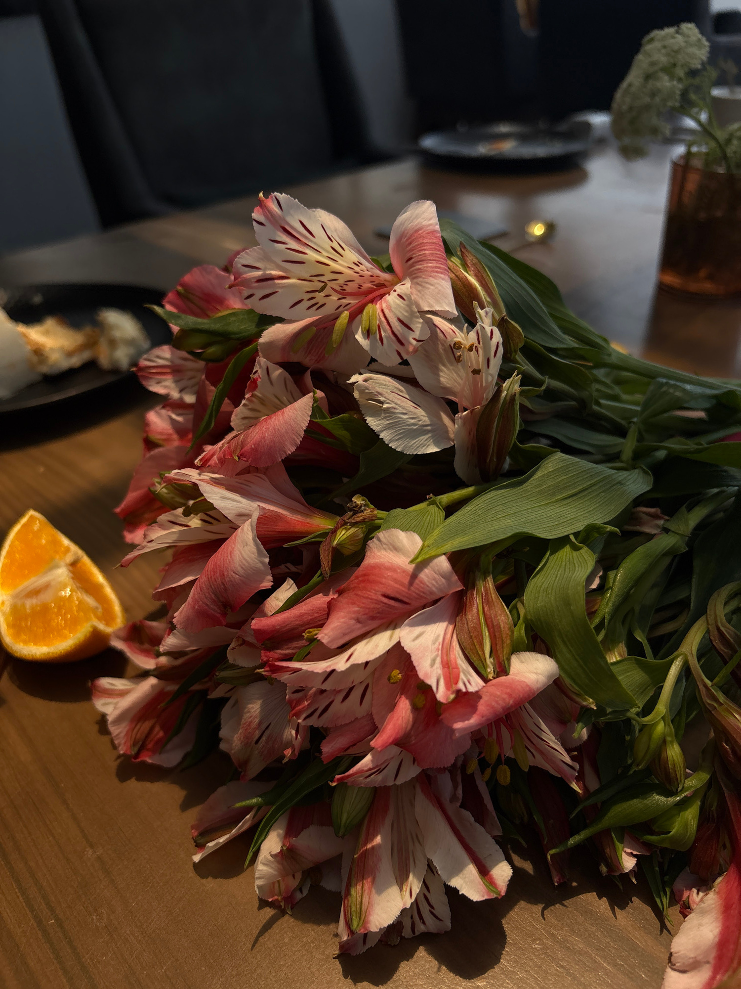 A high-angle shot displays a bouquet of pink and white striped alstroemeria flowers on a wooden surface, accompanied by a wedge of orange. A blurred dark grey or black object is visible in the lower l…read more