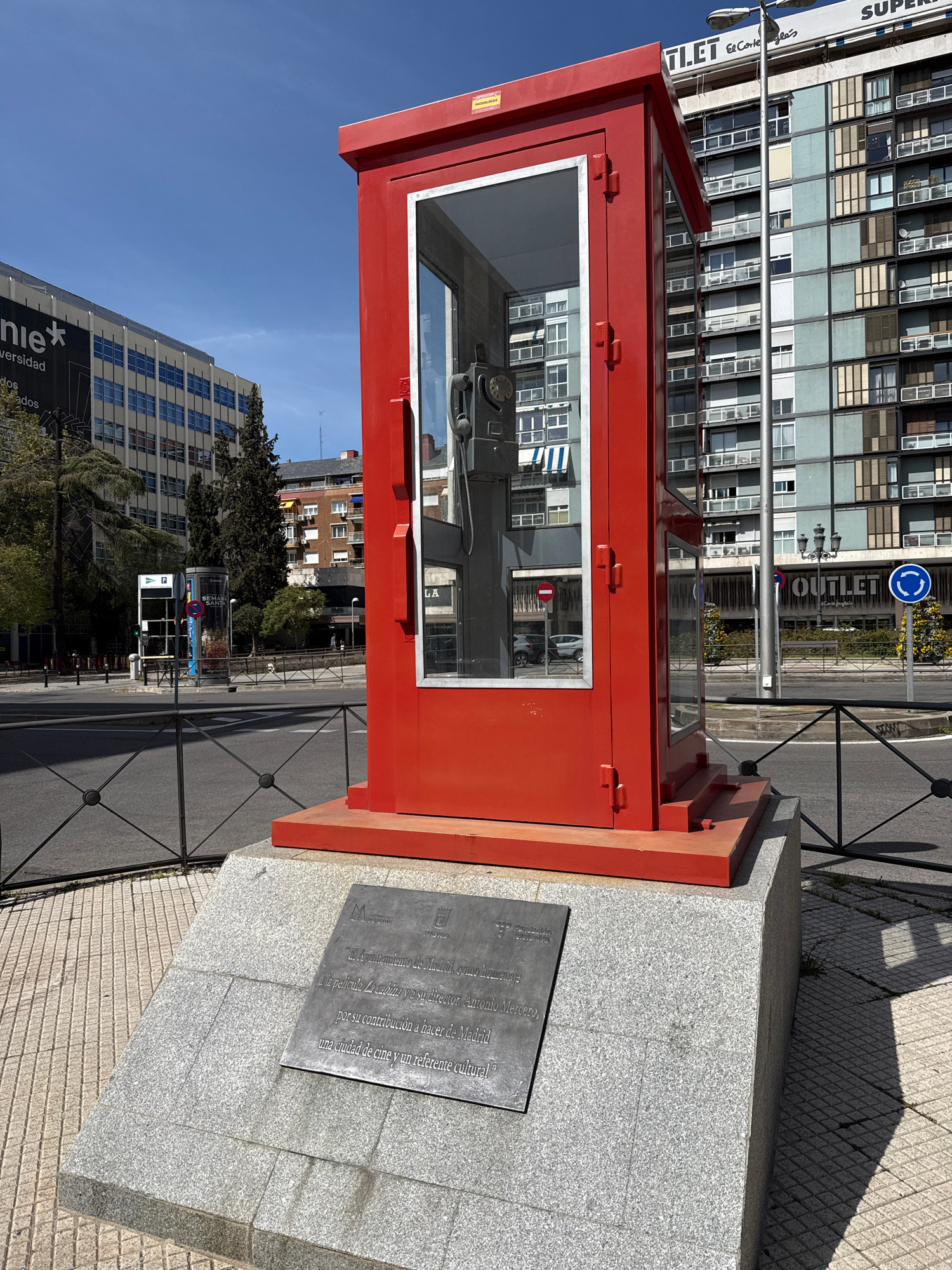 The image shows a decommissioned classic red British telephone box in Madrid, Spain. The box is mounted on a stone pedestal, with a plaque that states it's a tribute to the film 'La cabina' (The Telep…read more