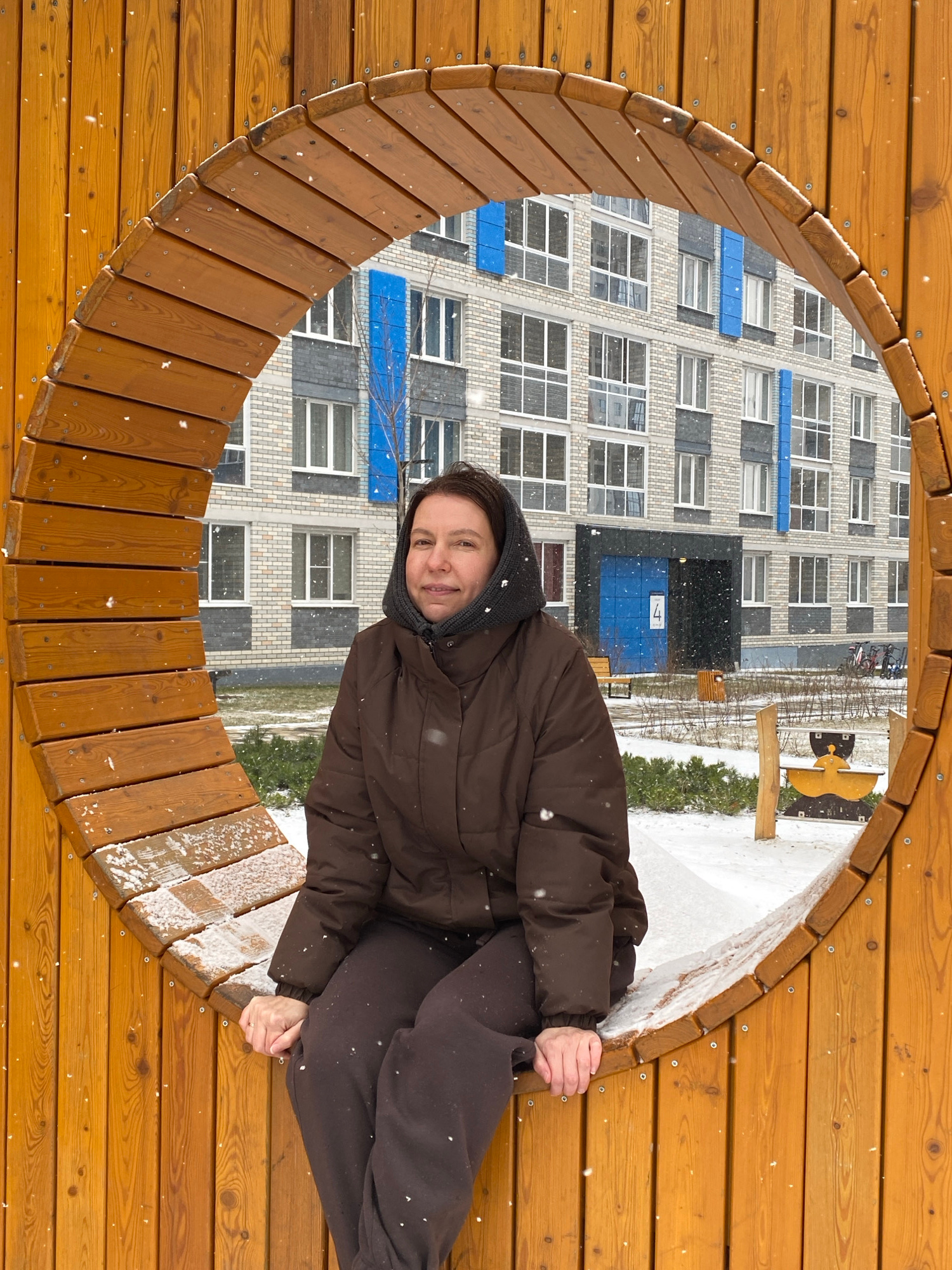 A woman in a brown jacket and hood is seated inside a circular wooden structure with snow. The backdrop features an apartment building with a blue entrance and white-framed windows, indicating the loc…read more