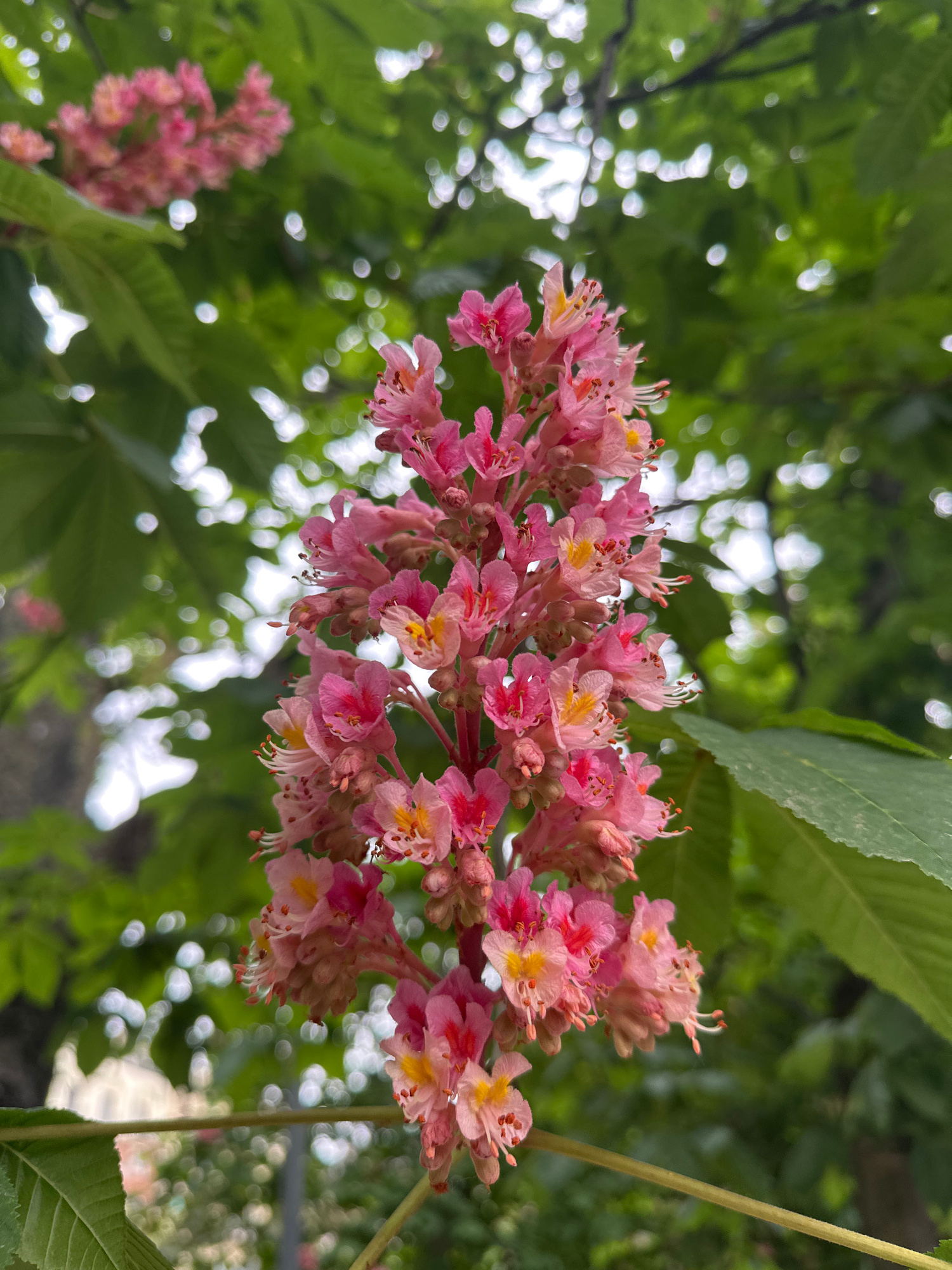 The image is a close-up shot of a cluster of pink flowers, likely Red Horse-Chestnut blossoms, with green leaves and blurred foliage in the background. The scene appears to be captured from below, loo…read more
