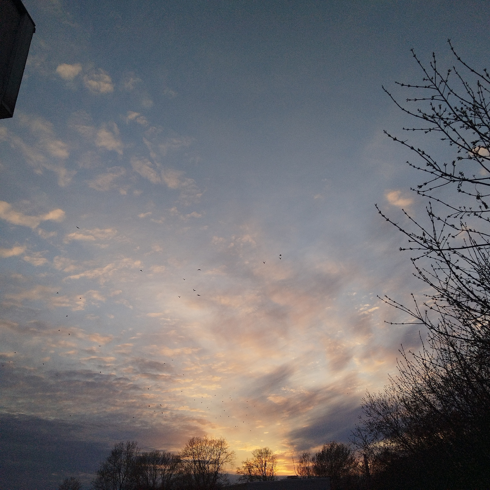 The photograph captures a sky at dusk in Yekaterinburg, Russia. A gradient of colors fills the sky, transitioning from blues to oranges and pinks near the horizon. The clouds are scattered, reflecting…read more