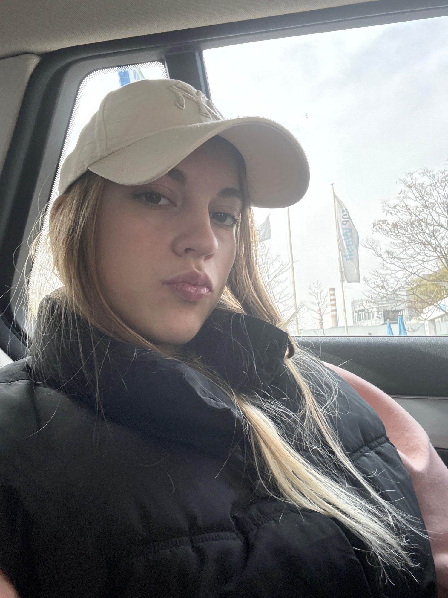 A young woman with fair skin and light brown hair with blonde highlights is wearing a light-colored baseball cap and a black puffer jacket. She is positioned inside a vehicle, near a window. Outside t…read more