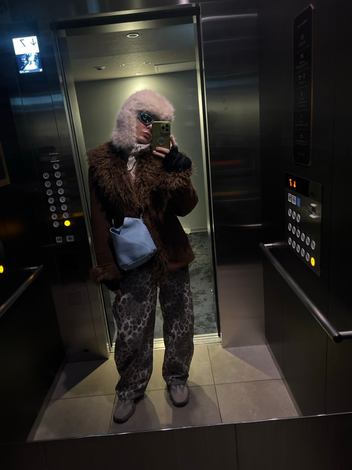 A person takes a mirror selfie in an elevator. They are wearing a furry hat, sunglasses, a fur coat, patterned pants, and grey shoes. They hold a phone in their left hand and wear a black glove on tha…read more