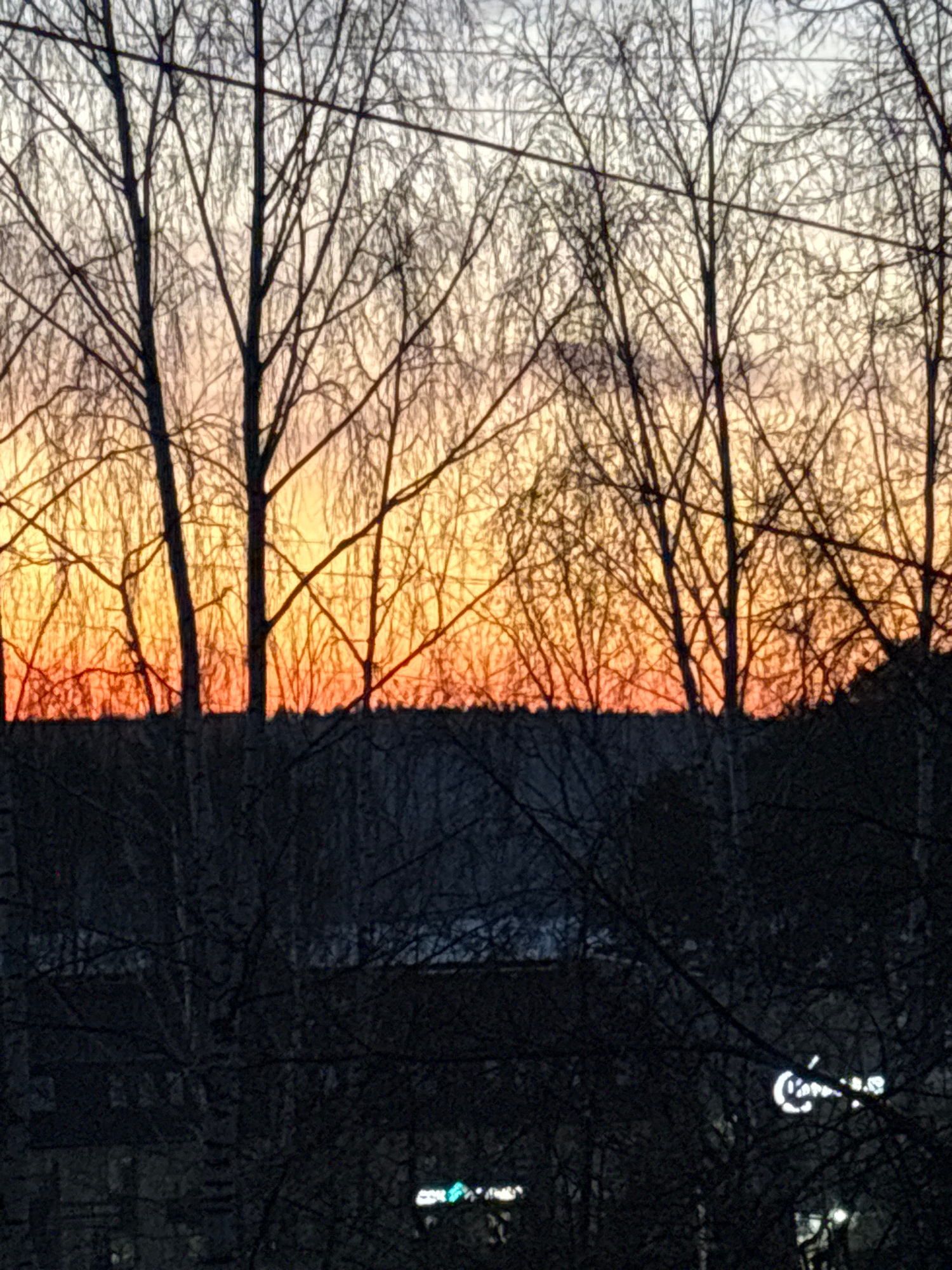 The image shows bare branches of a tree silhouetted against a sky that transitions from light gray to orange-yellow. On the right side, the branches are very dark, possibly obscuring a building with l…read more