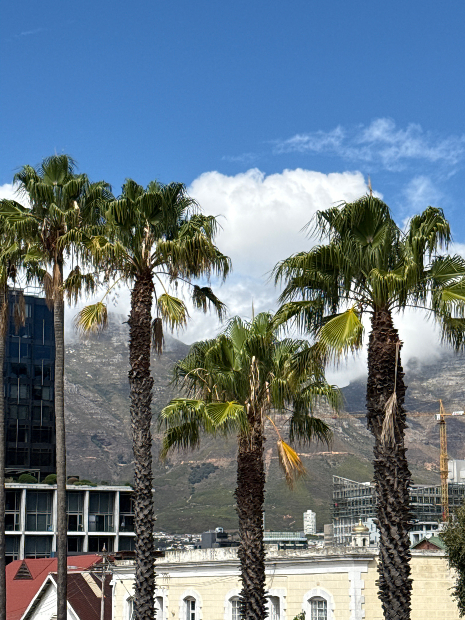 The image shows palm trees in the foreground against a backdrop of mountains and a city skyline. The sky is blue with white clouds. Buildings are visible, including some with windows. In the backgroun…read more