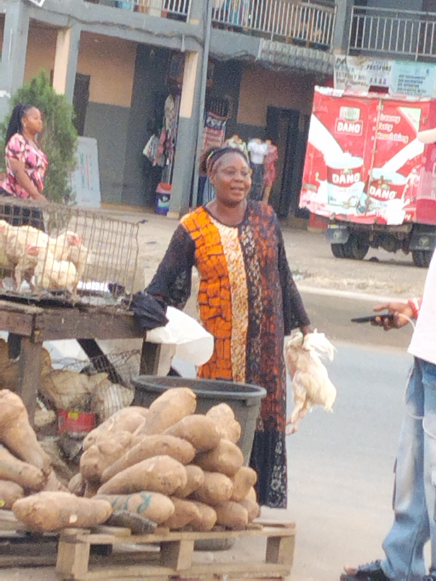 In a busy street scene in Aba, Nigeria, a woman in a long, patterned dress stands next to a stall. The stall is loaded with yams on a wooden pallet in the foreground, while chickens are caged on a hig…read more