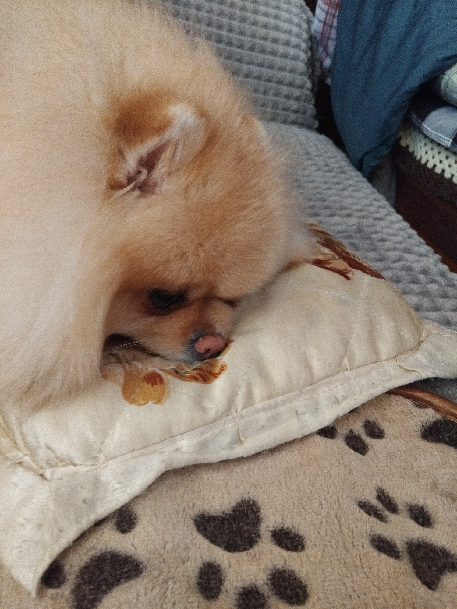 A light-orange Pomeranian dog is sleeping on a beige cushion. The cushion has a floral pattern with brown flowers on one side, and a black and white animal print on the other side. The cushion rests o…read more