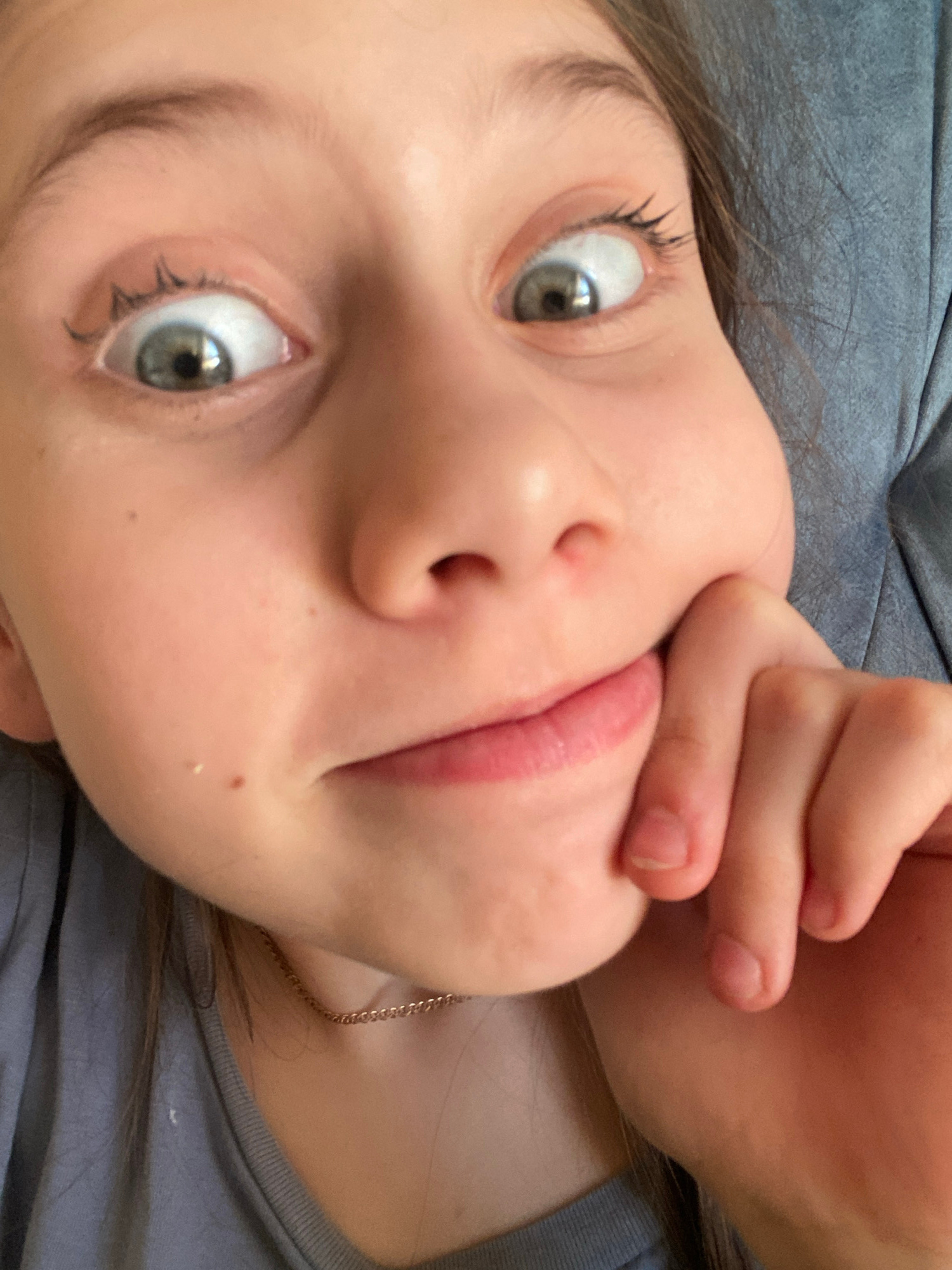 The image shows a close-up portrait of a young person, possibly a child or pre-teen, lying down, with their head tilted. The person's face occupies a significant portion of the frame, angled from the…read more