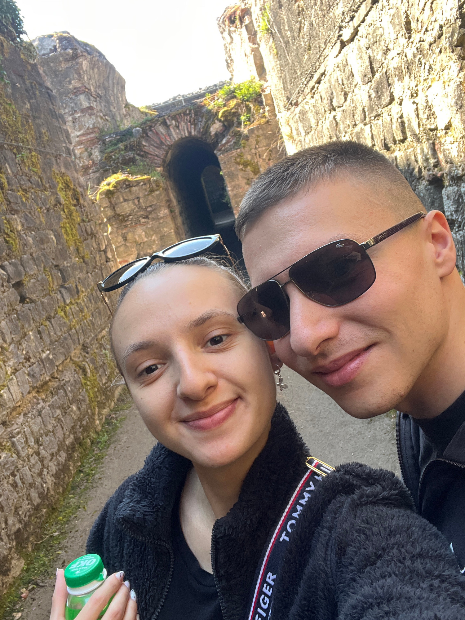 A selfie shows two people standing together outdoors. The person on the left is wearing dark sunglasses. The person on the right is wearing sunglasses on top of their head and holds a green and whiteβ¦read more