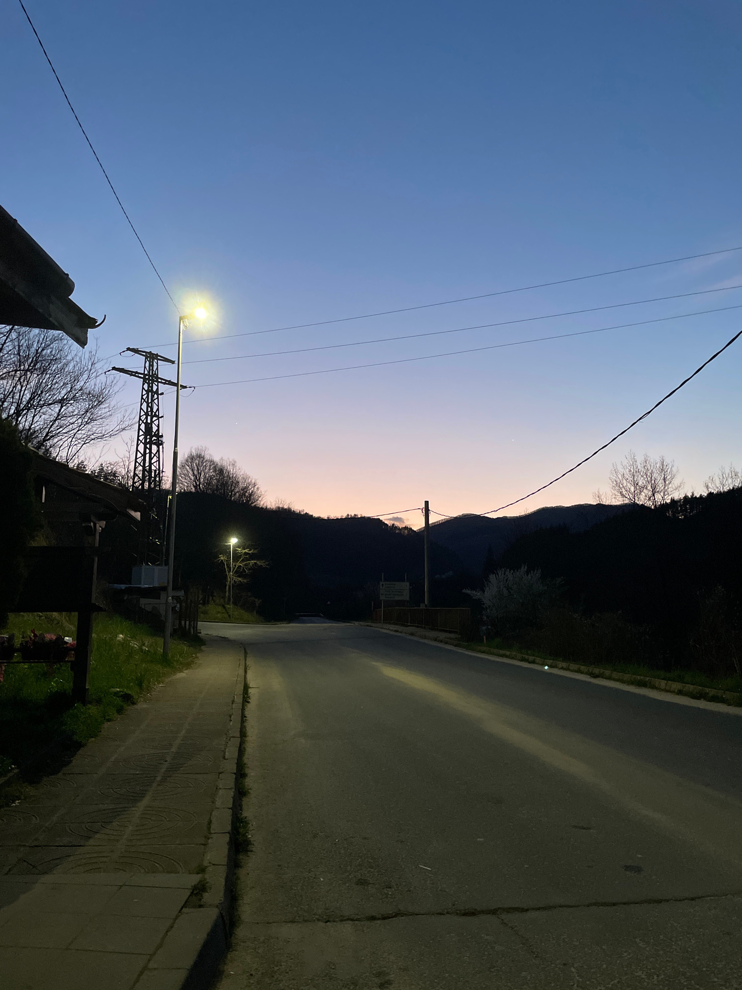 The image depicts a street scene at dusk or dawn in Zlatograd, Bulgaria. The road curves gently to the right, with a narrow sidewalk on the left side of the frame. A line of trees borders the right si…read more