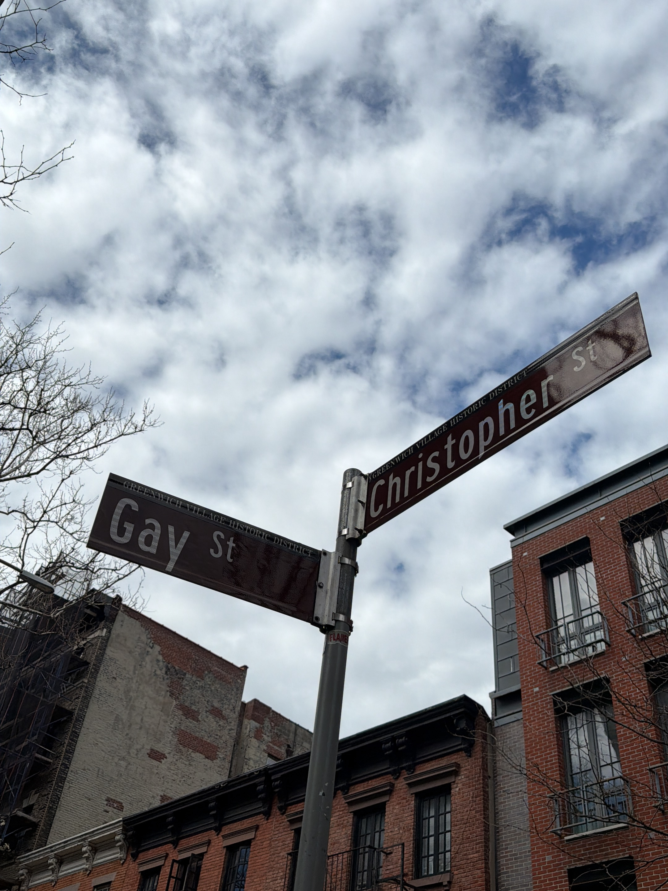 The image shows a street sign at the intersection of Gay Street and Christopher Street in New York City. The street sign is dark brown with white lettering. The sky is cloudy. Buildings are visible in…read more