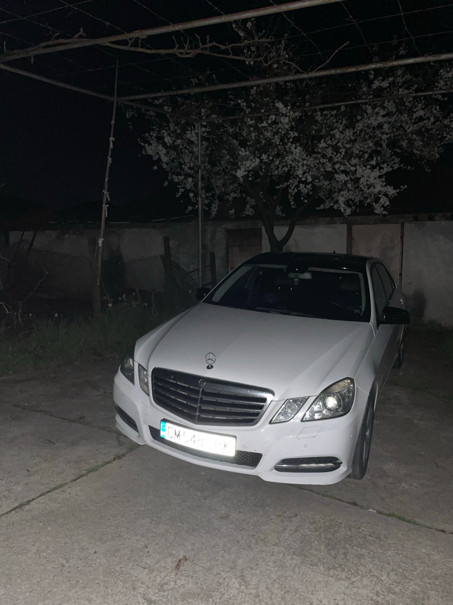 A white Mercedes-Benz E-Class sedan is parked on a concrete driveway at night in Zlatograd, Bulgaria. The car is facing the camera. The license plate reads "CM 5487 BK". A flowering tree is visible on…read more