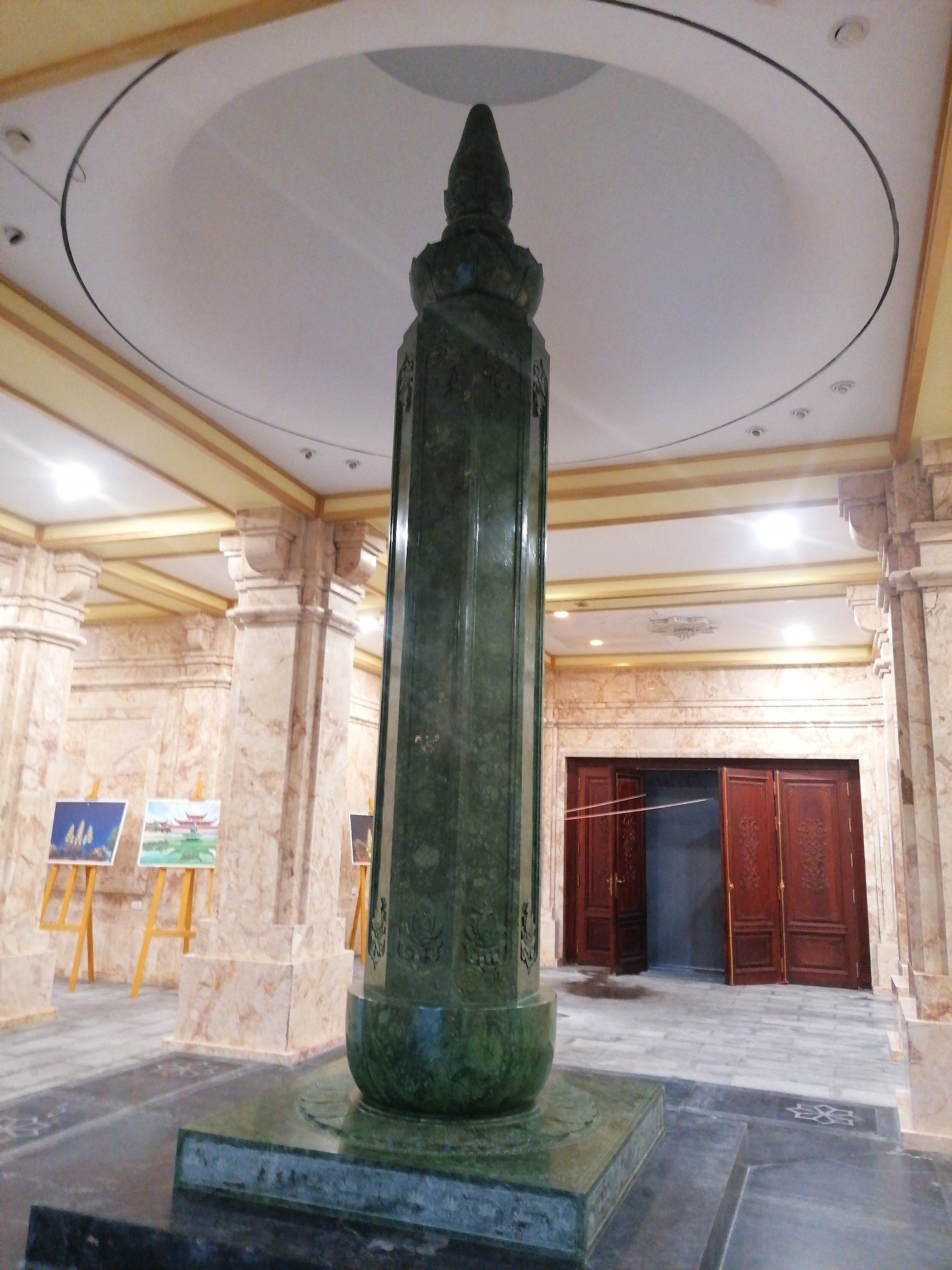 A tall, green, jade-like pillar stands prominently in a large, opulent room. The pillar has a bulbous base and a tapering top, with decorative carvings along its shaft. It sits on a multi-tiered platf…read more