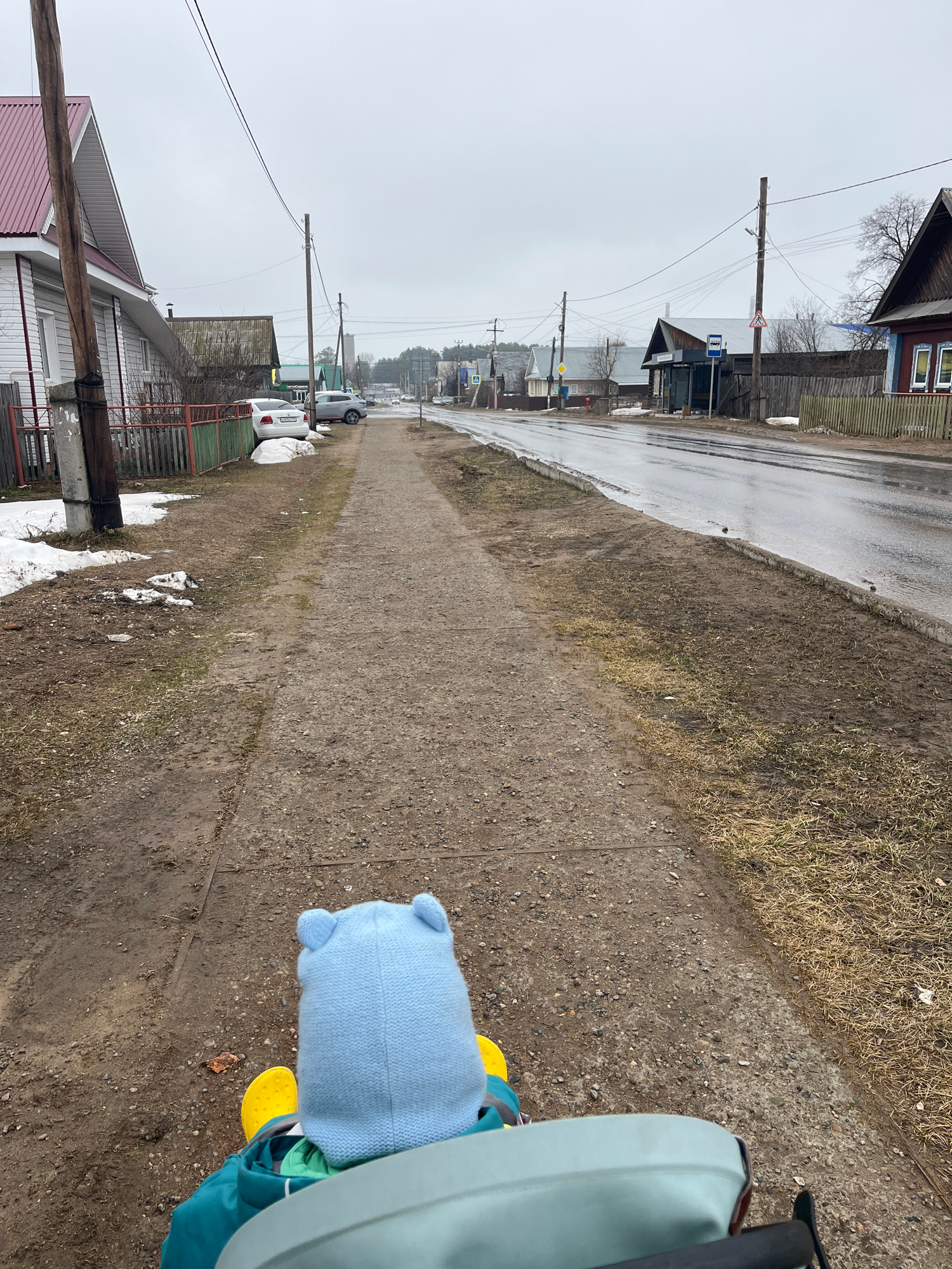An eye-level, outdoor photograph depicts a street scene on a damp day in what appears to be a residential area of Chaikovsky, Russia. The perspective is from the point of view of someone pushing a strβ¦read more