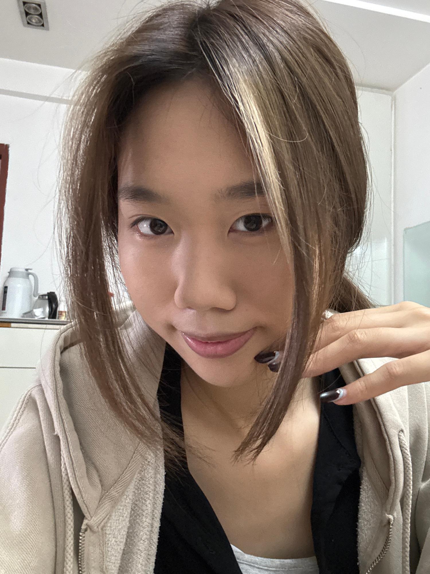 A young woman with light brown hair with blonde highlights poses for a selfie. She is wearing a black t-shirt under a light beige zippered hoodie. Her hand, with black and silver painted nails, is nea…read more