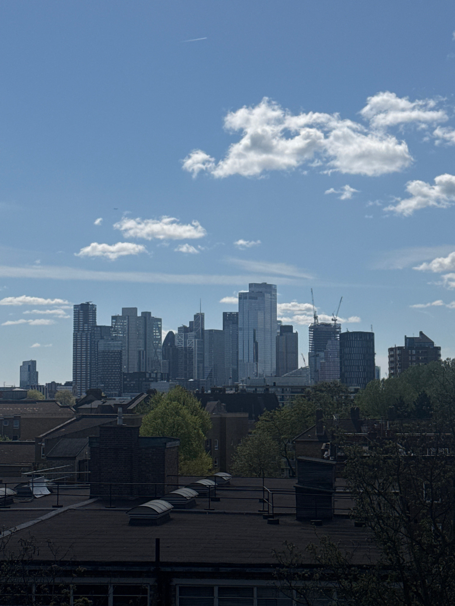 The image captures a skyline view in London, United Kingdom, juxtaposing residential rooftops with modern skyscrapers. The sky is a bright blue with scattered white clouds. Tall buildings, including s…read more