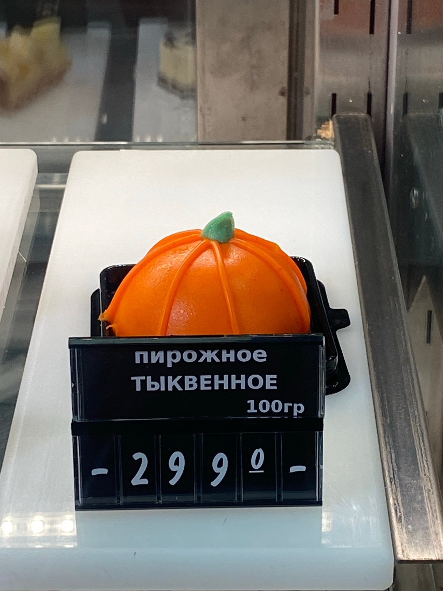 The image displays a single, vibrant orange pastry, meticulously shaped like a pumpkin, presented for sale in what appears to be a retail display case. The pastry features distinct vertical ridges, ty…read more