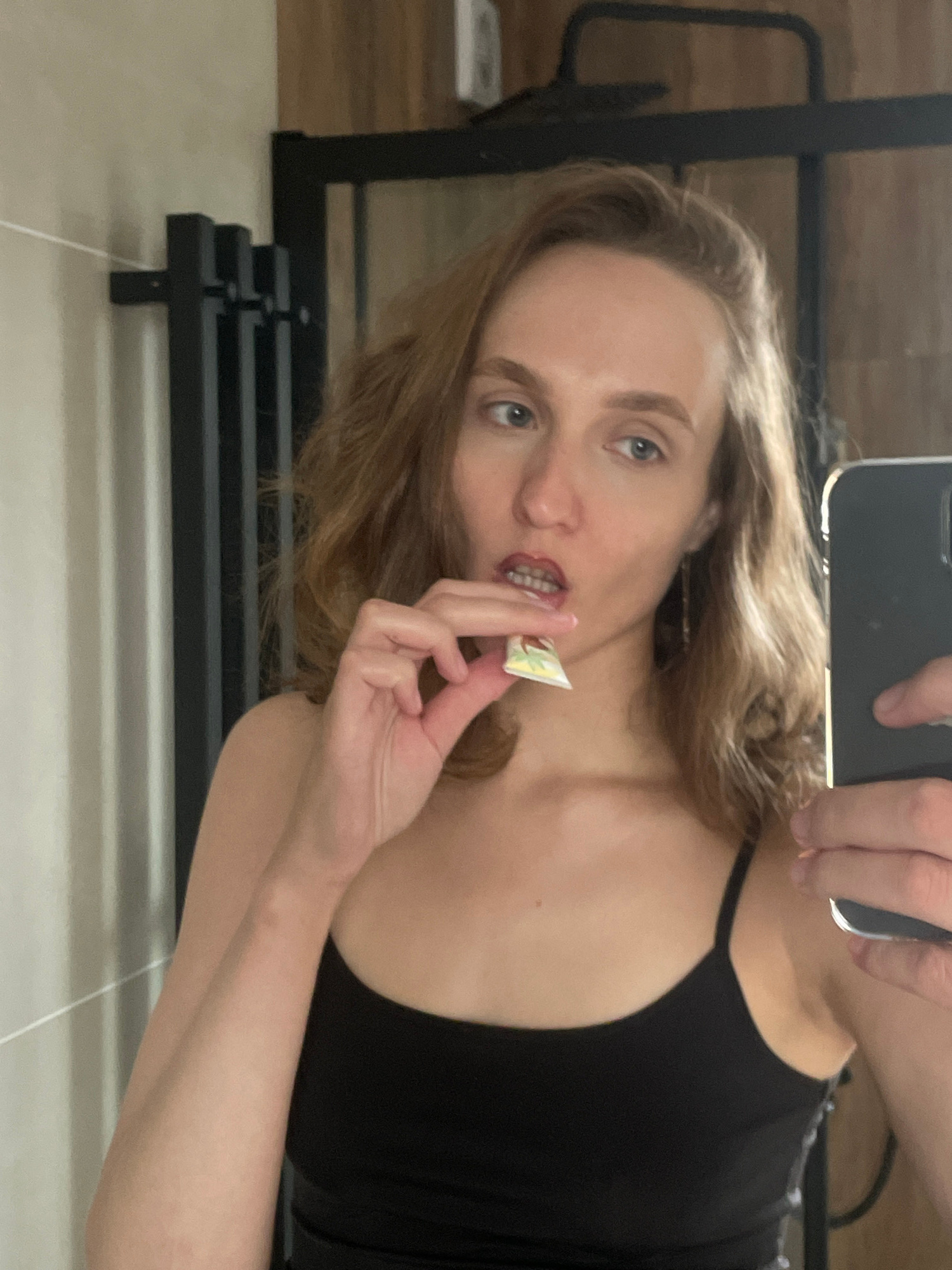 The image is a mirror selfie taken by a woman in an indoor setting, likely in Podshivalovo, Russia, as indicated by the location context. The photo is notably rotated, giving the impression that the w…read more