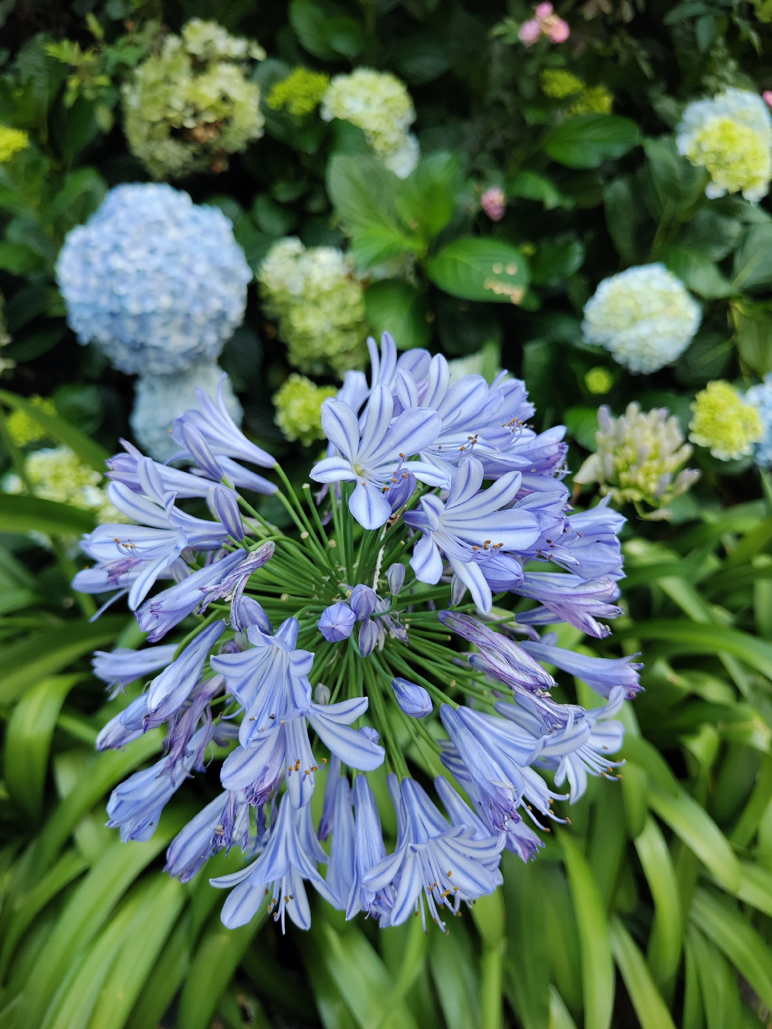 The image shows a close-up of a cluster of light blue and white striped agapanthus flowers in full bloom, with green, blade-like foliage below. In the background, there are blurred clusters of blue, g…read more