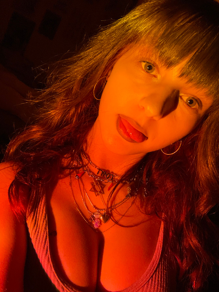A close-up portrait captures a woman with her face and upper torso illuminated by dramatic, warm orange and red light, creating prominent shadows, especially on her nose. She has long, wavy dark hair…read more