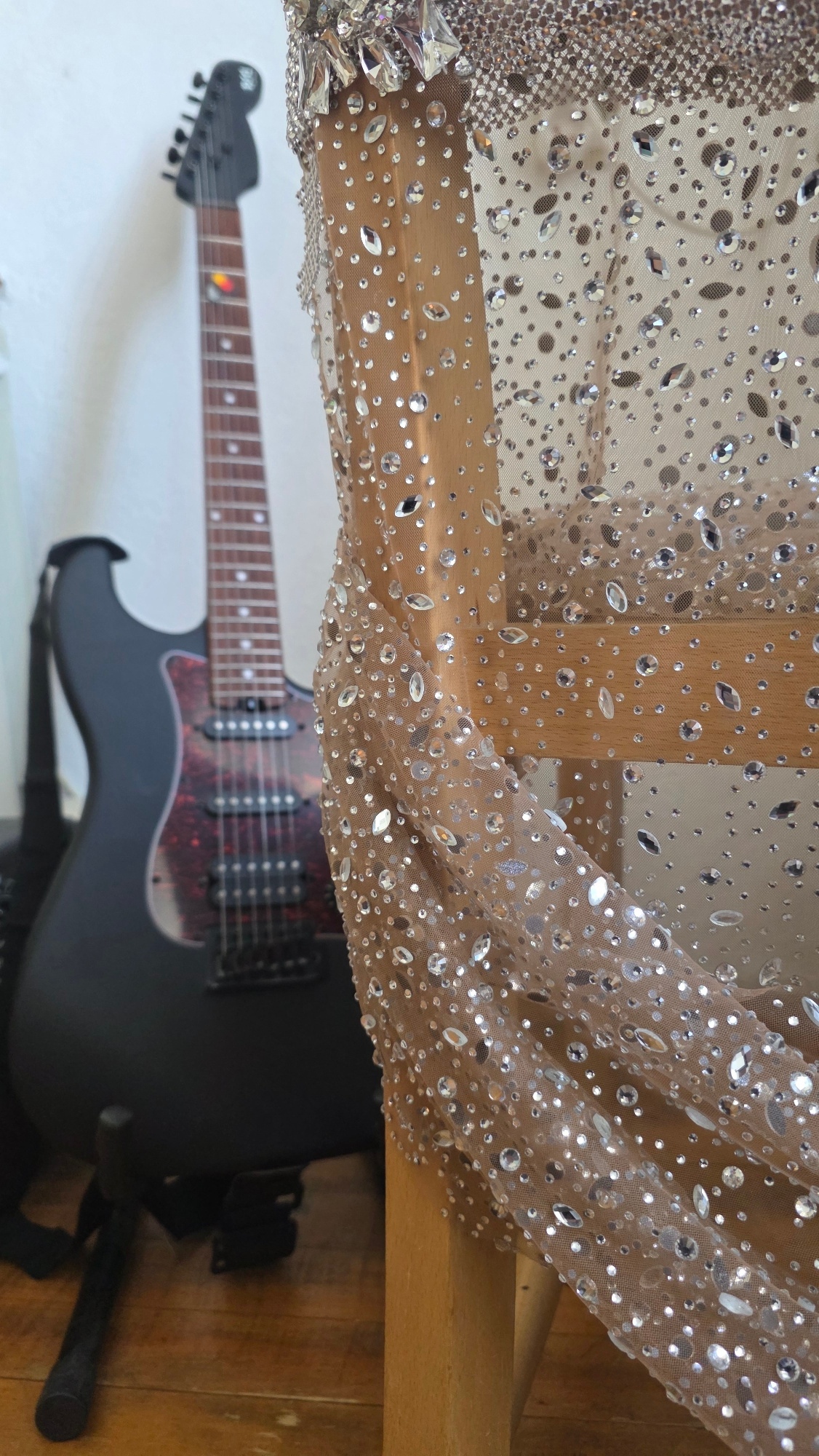An indoor, medium-shot photograph, likely taken in Blagoevgrad, Bulgaria, captures a glittering, translucent fabric draped over a wooden structure, with an electric guitar positioned below. The upperβ¦read more