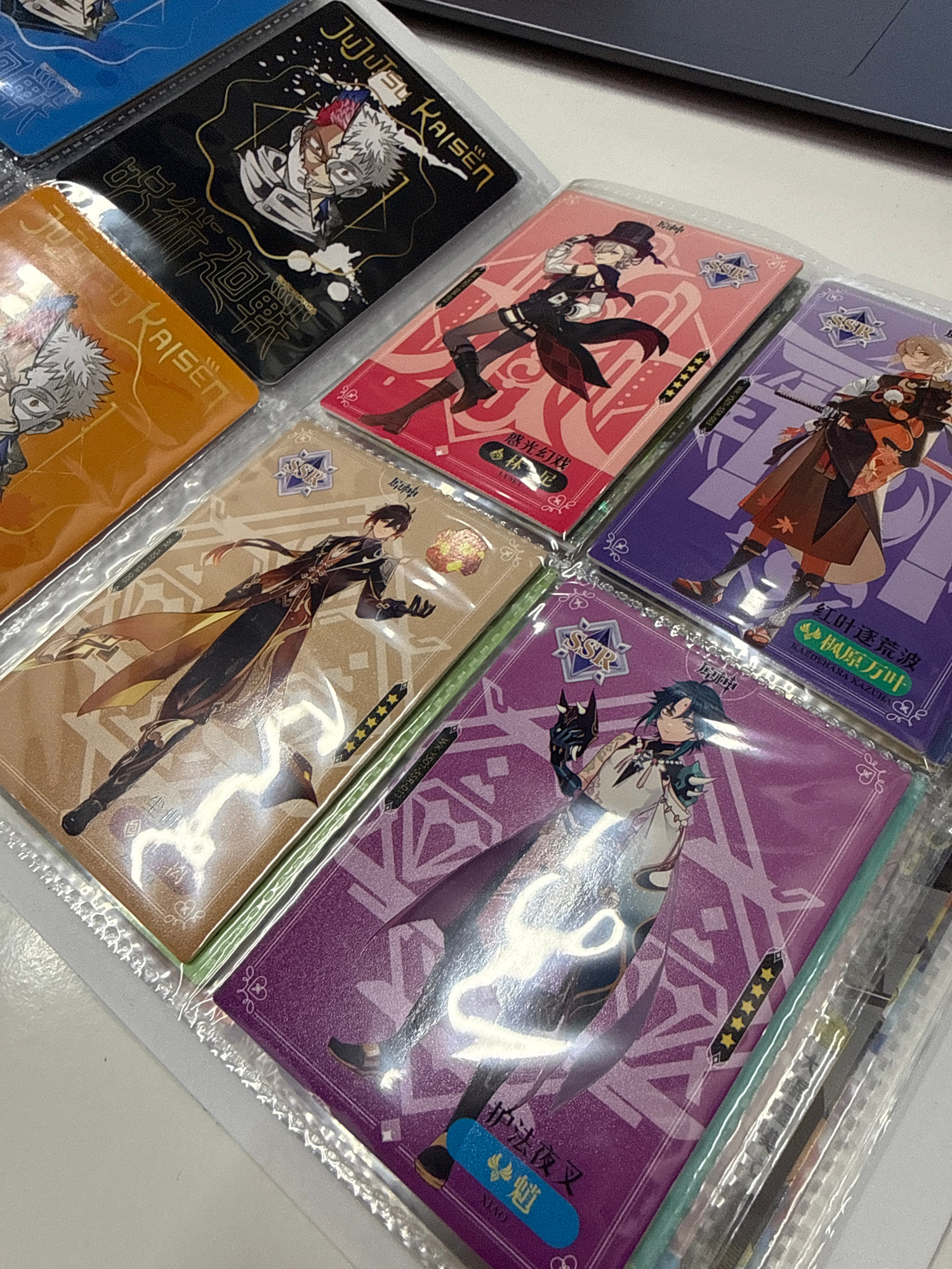 The media file captures a collection of anime and video game trading cards, meticulously organized in clear plastic sleeves within a binder, laid flat on a light-colored surface. A dark electronic dev…read more