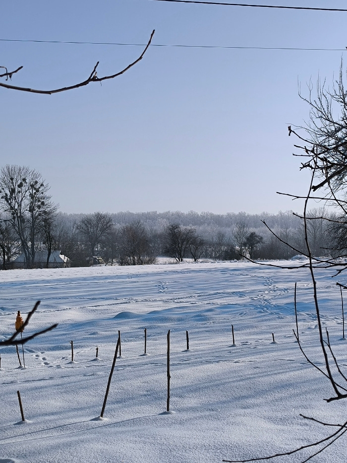 The image depicts a snow-covered rural landscape in Parkhomivka, Ukraine, under a clear, light blue sky. A single, thin, dark power line traverses the upper sky horizontally. In the foreground, out-of…read more
