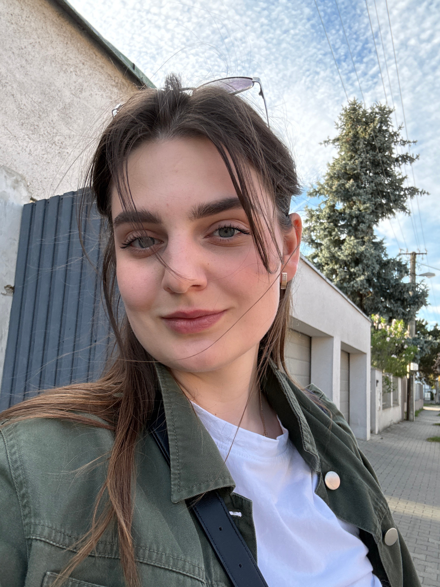 The image is a tilted outdoor portrait of a young woman taken in Trnava, Slovakia. The woman, with light brown, slightly windswept hair and green eyes, looks directly at the camera with a subtle, pleaβ¦read more