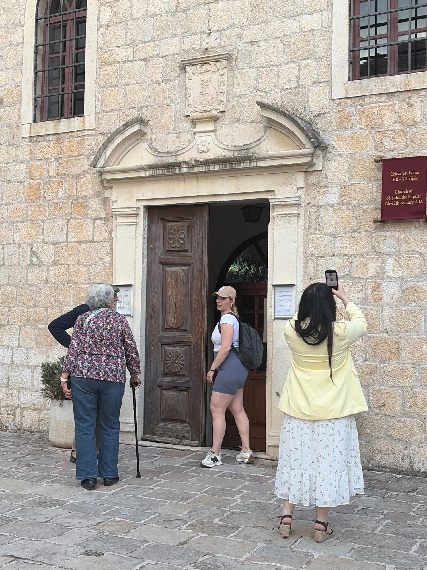 Here is a detailed description of the image: **Scene:** The image shows the Church of St. John the Baptist in Budva, Montenegro. This church is a historic stone building. **People:** * An elderly…read more