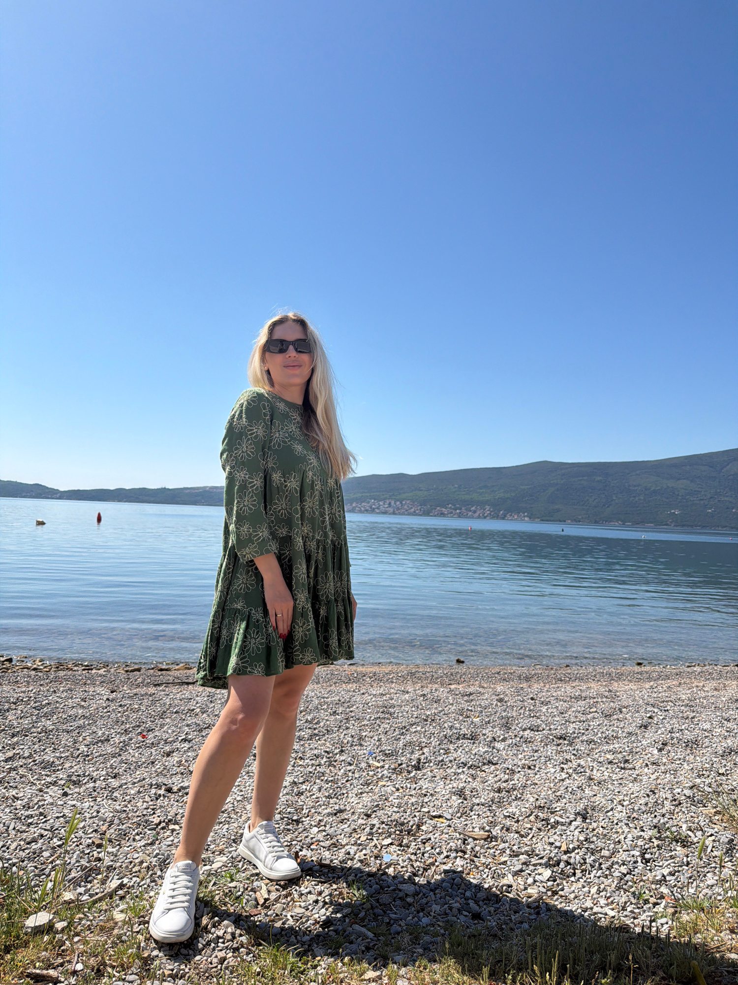 A woman stands on a pebbly beach beside a body of water. She has blonde hair, is wearing sunglasses, and a green floral dress. She is also wearing white sneakers. In the background is a mountain rangeβ¦read more