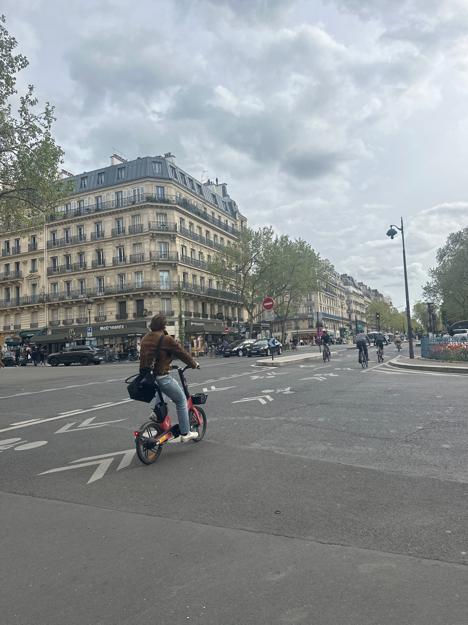 The image shows a street scene in Paris, France. A person wearing a brown jacket, blue jeans, and white shoes is riding a red Vélib' bike on a gray asphalt road marked with white directional arrows. The cyclist is positioned in the lower right corner of the frame. Behind the cyclist is a large building with multiple stories, many windows, and balconies. A "McDonald's" sign is visible on the building. A tree with green leaves is on the left edge of the frame. In the background are other people, cars, and bicycles on the street. The sky is overcast with gray clouds. A tall lamp post is visible in the middle of the image. | Open Wire