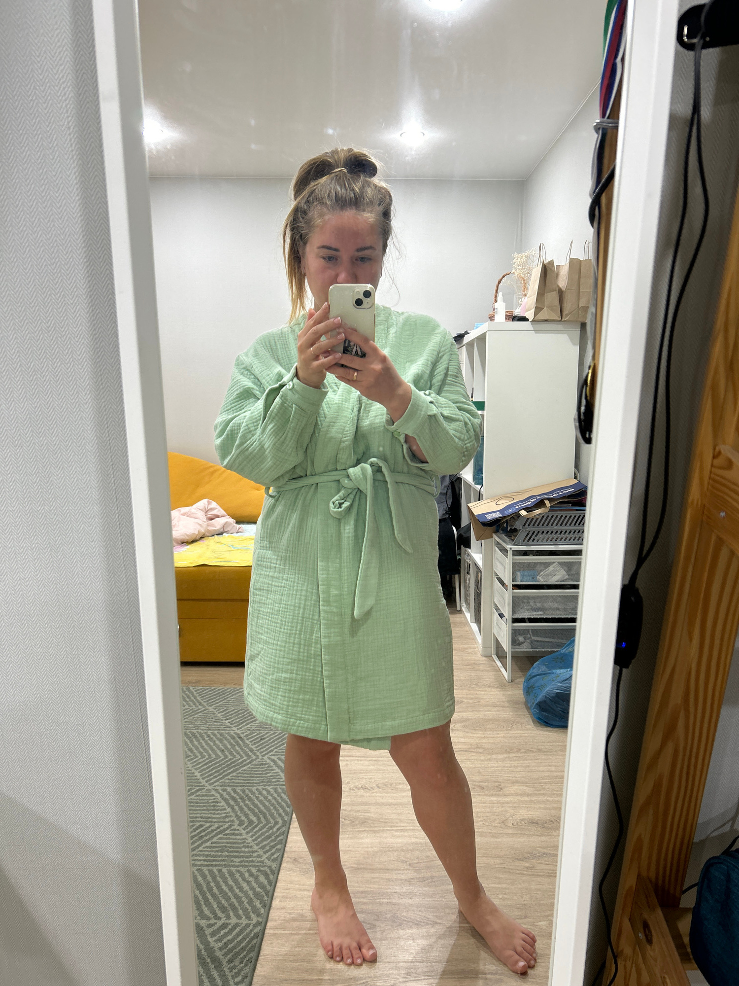 A young woman is taking a selfie in a mirror. She is wearing a light green robe and holding a white smartphone. The room appears to be a bedroom, with a bed, shelving unit, and rug visible. The locati…read more