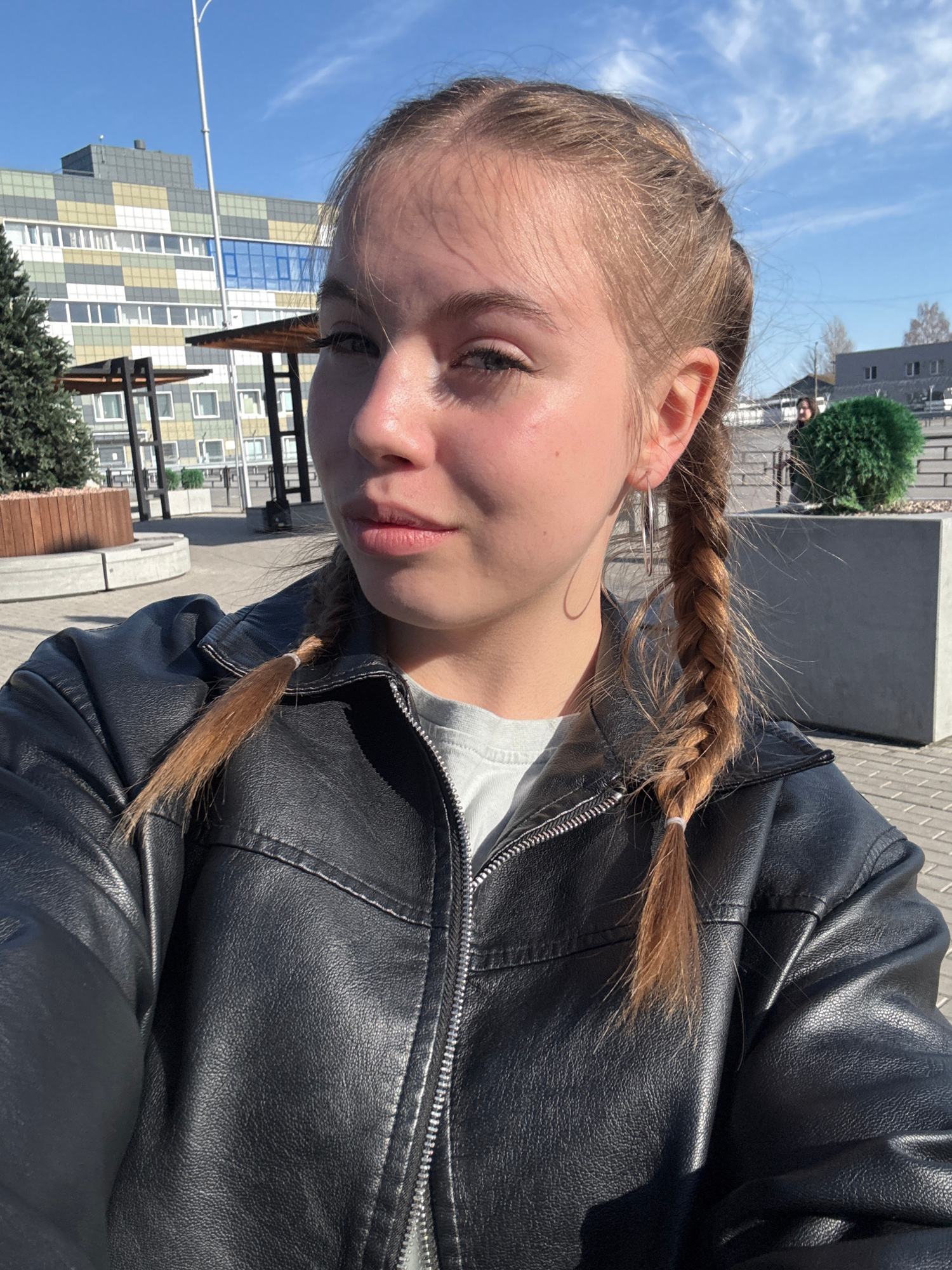 A young woman with fair skin and blonde hair braided into pigtails is positioned close to the camera, suggesting a selfie perspective. She is wearing a black leather jacket over a white shirt. The sce…read more