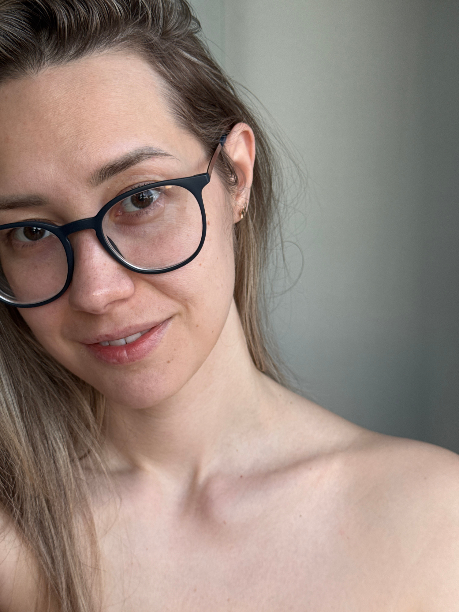 A fair-skinned woman with light brown hair is lying down, tilted on her left side. She is wearing black-rimmed glasses. Only a portion of her neck and shoulder are visible. There is a light gray backg…read more