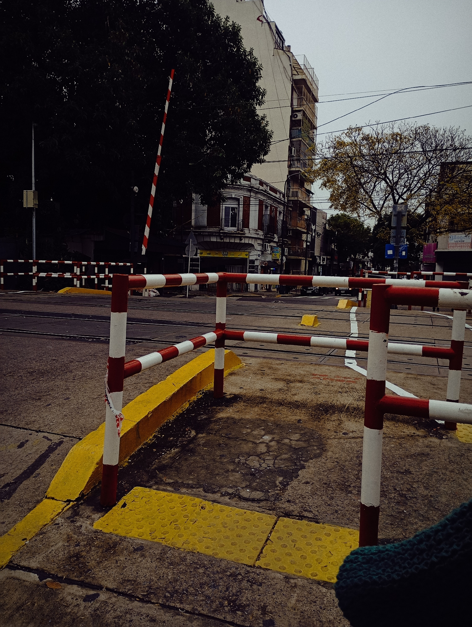 An eye-level shot depicts a railroad crossing in the city of Buenos Aires, Argentina. The foreground features a pedestrian barrier of red and white striped poles. The curb is painted bright yellow wit…read more