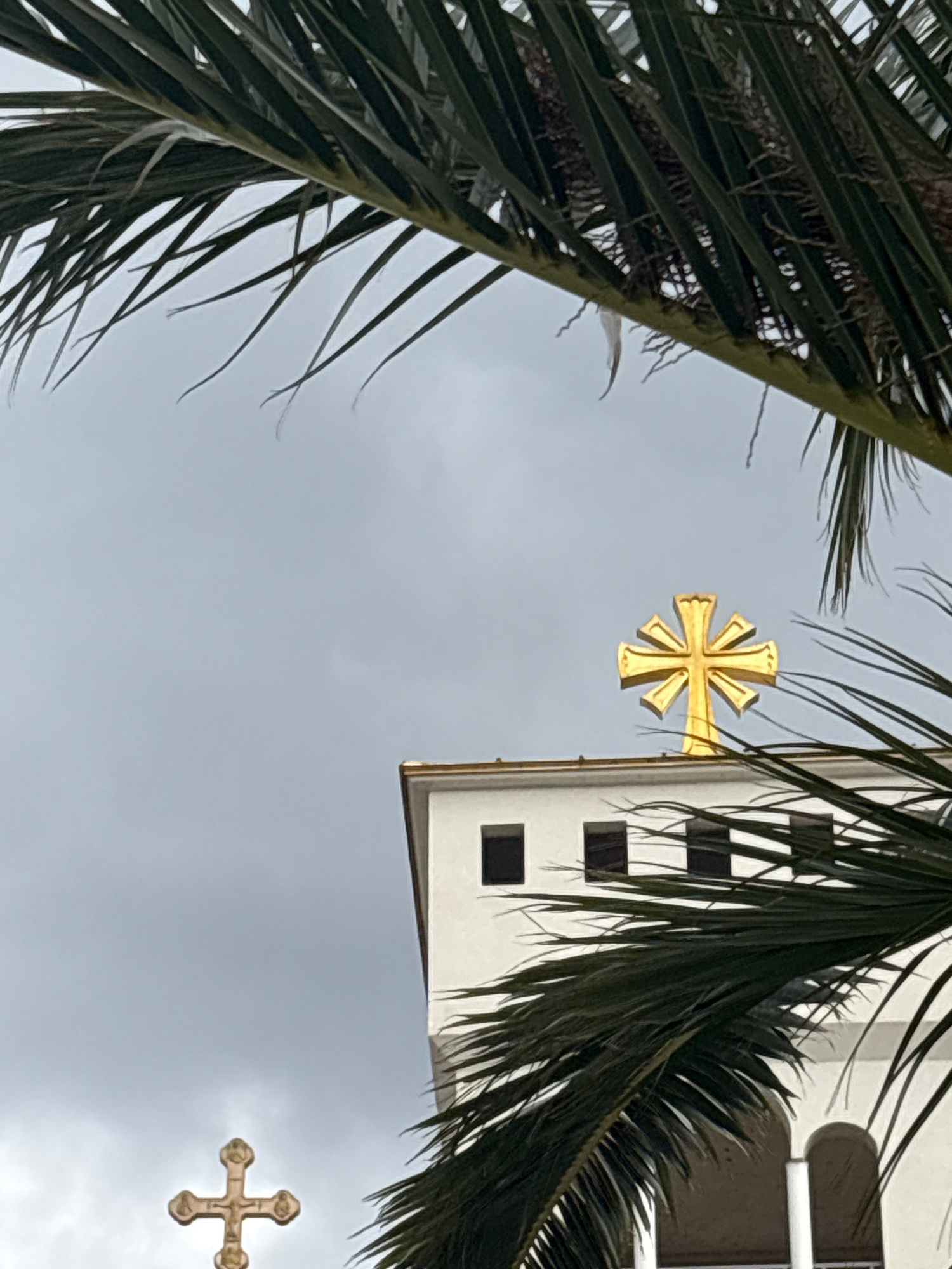 A low-angle shot shows a building with a golden cross, partially obscured by palm fronds, against a cloudy sky. Two crosses are visible on the building. The building appears to be located in Bar, Mont…read more
