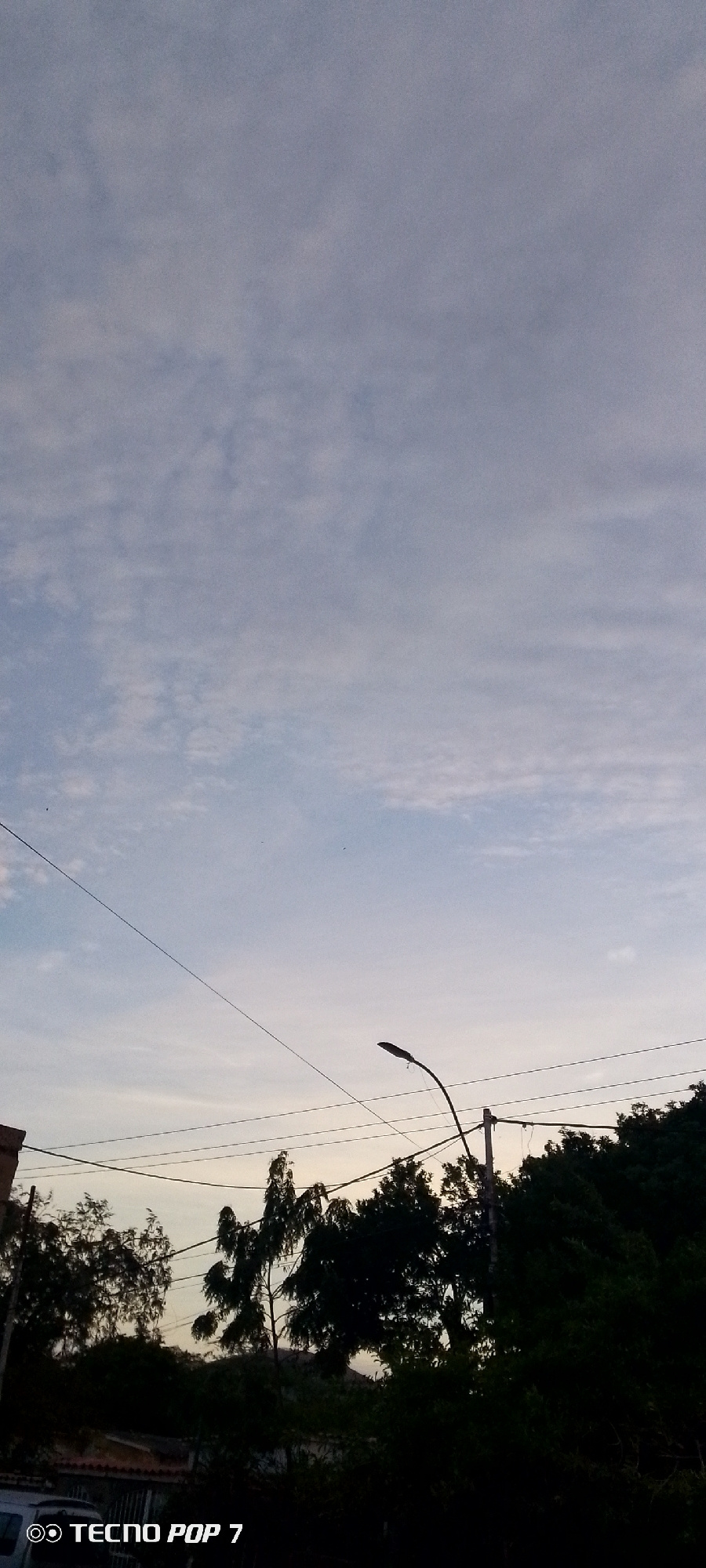 The image shows a street scene in Altagracia, Venezuela, taken at dusk or dawn. The sky is a mix of pale blue and gray, with thin, scattered clouds. Several power lines stretch across the frame. In the lower part of the image, there is a row of trees and a street light. The leaves are dark green, possibly due to the low light conditions. The bottom of the image also shows parts of a building, including a white car with a logo reading "TECNO POP 7" in the corner. | Open Wire