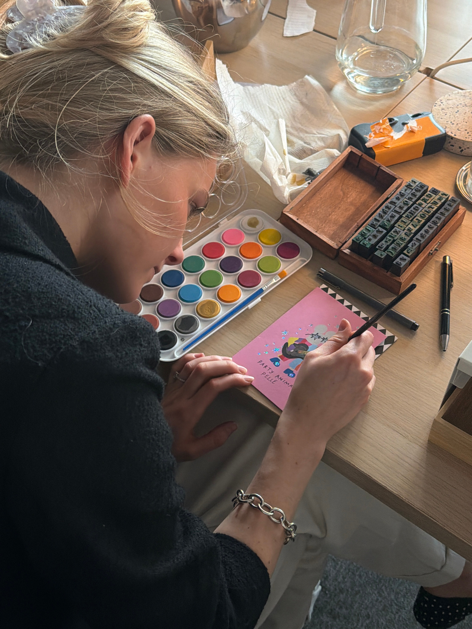 A young woman with blonde hair, styled in a messy bun, is partially visible in this top-down shot, engaged in an art activity at a light-colored wooden table in an indoor setting. She is wearing a dar…read more