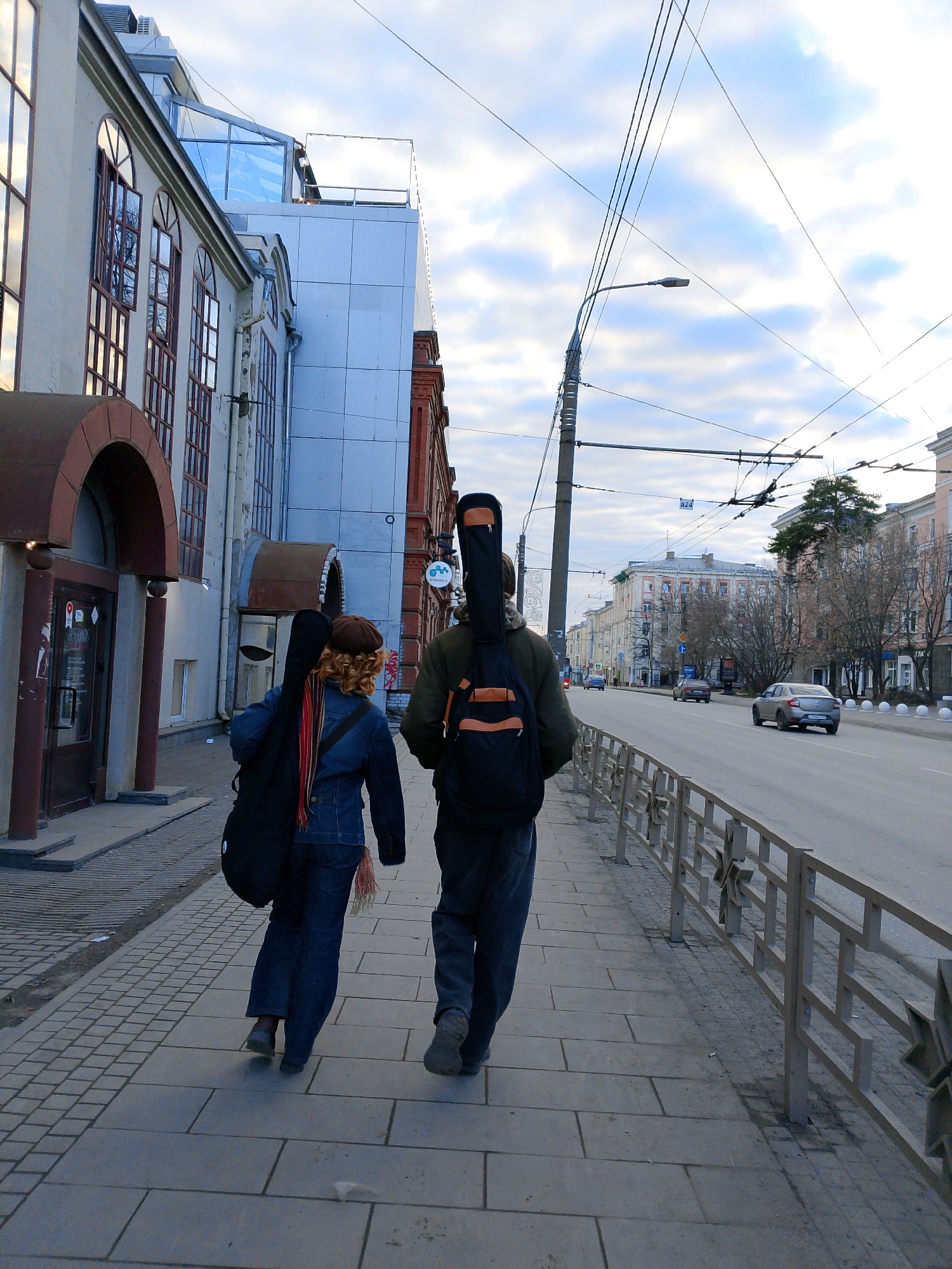 Two people with guitar cases are walking on a sidewalk. The person on the left is wearing a denim jacket and the person on the right is wearing a dark jacket and a backpack. They are walking away fromβ¦read more