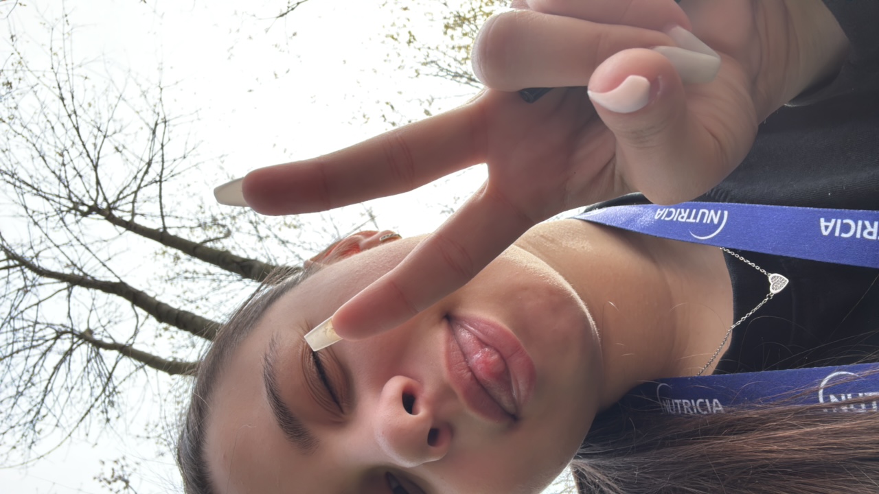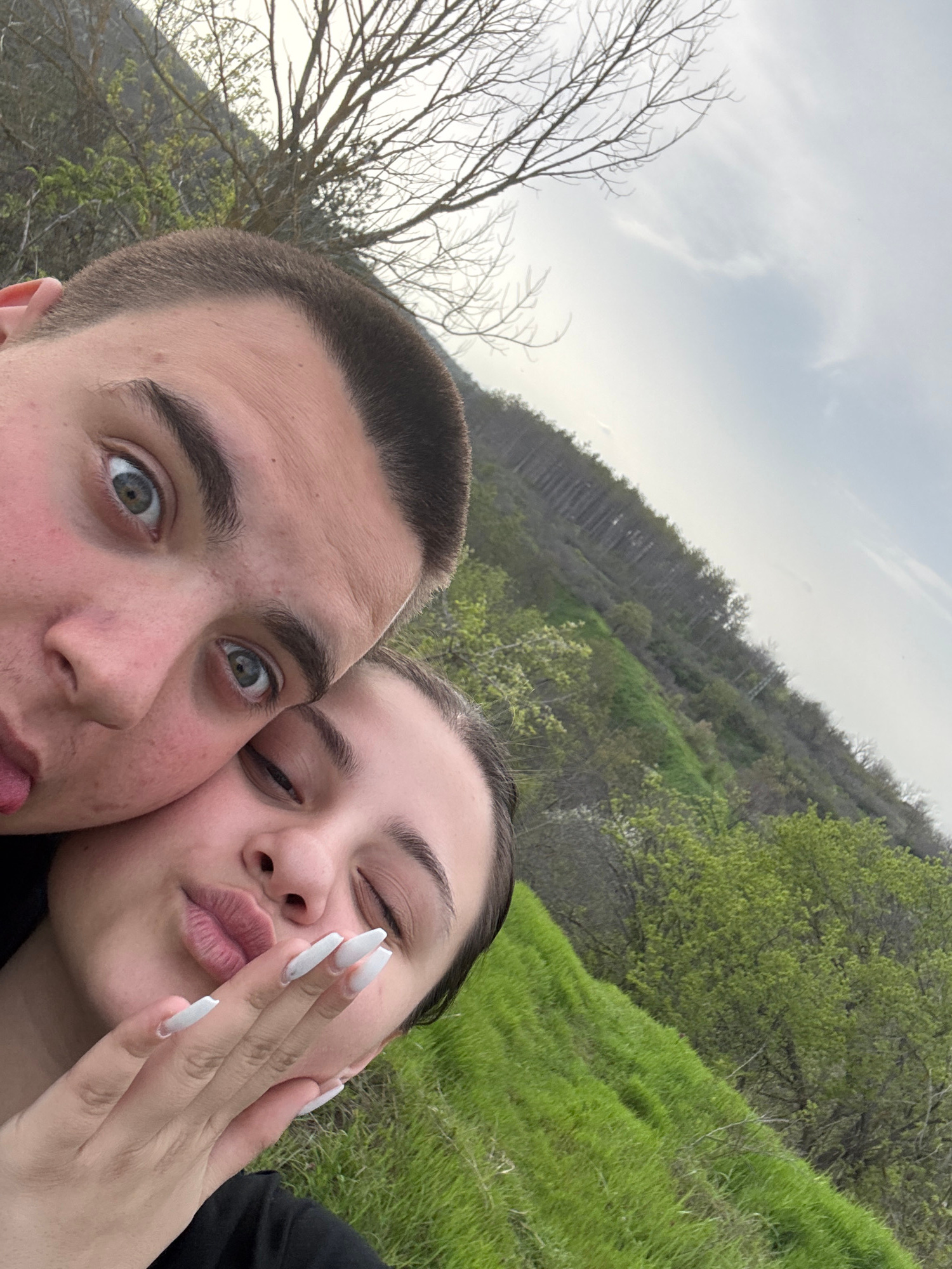 The image is a selfie taken outdoors, likely on a hillside given the sloping green grass and tree-covered terrain in the background. Two individuals are the focus. The person on the left is a male wit…read more