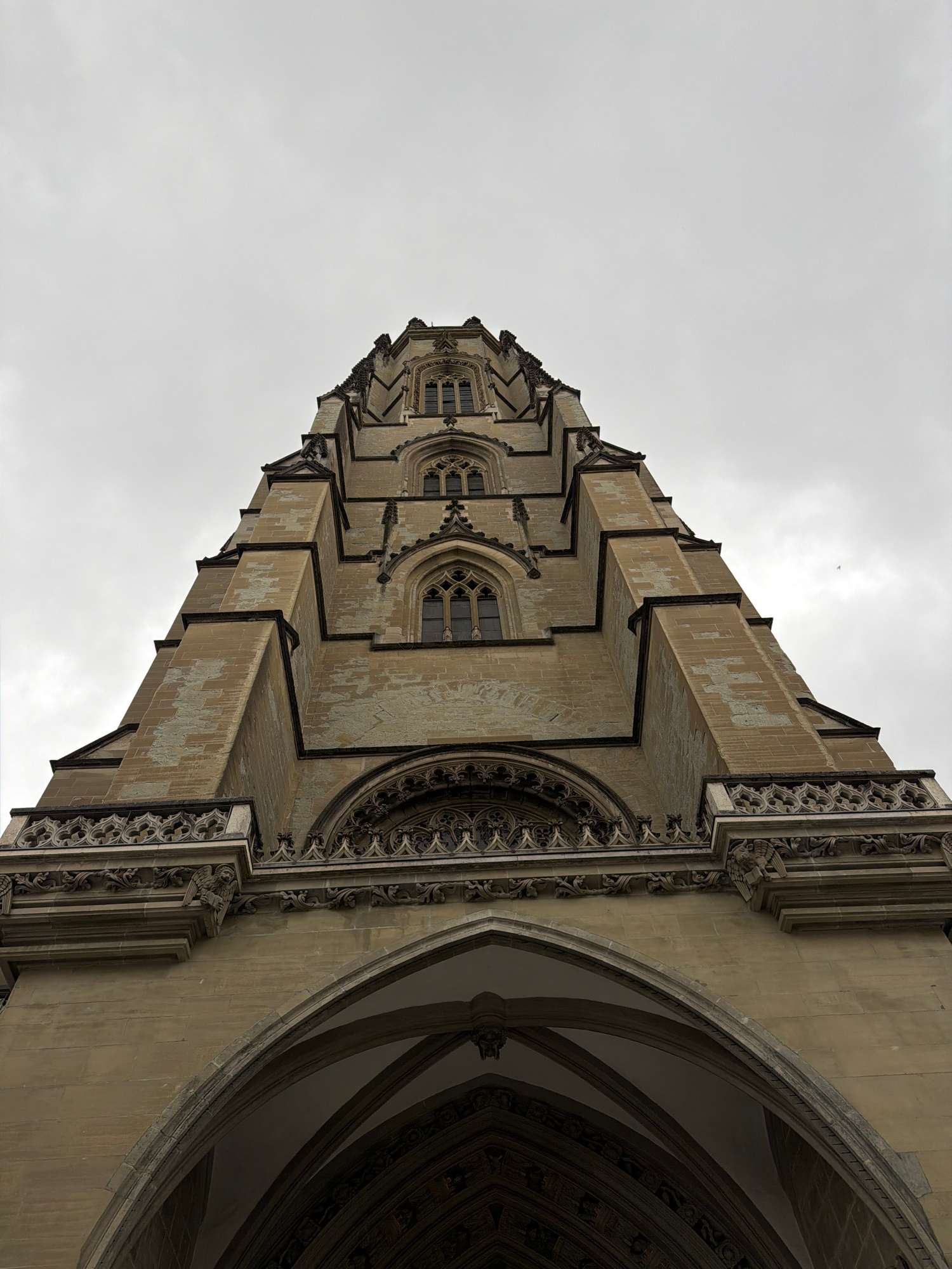The image displays a low-angle view of the lower and middle sections of the St. Nicholas Cathedral tower in Fribourg - Freiburg, Switzerland, positioned against an overcast, light grey sky. The Gothic…read more